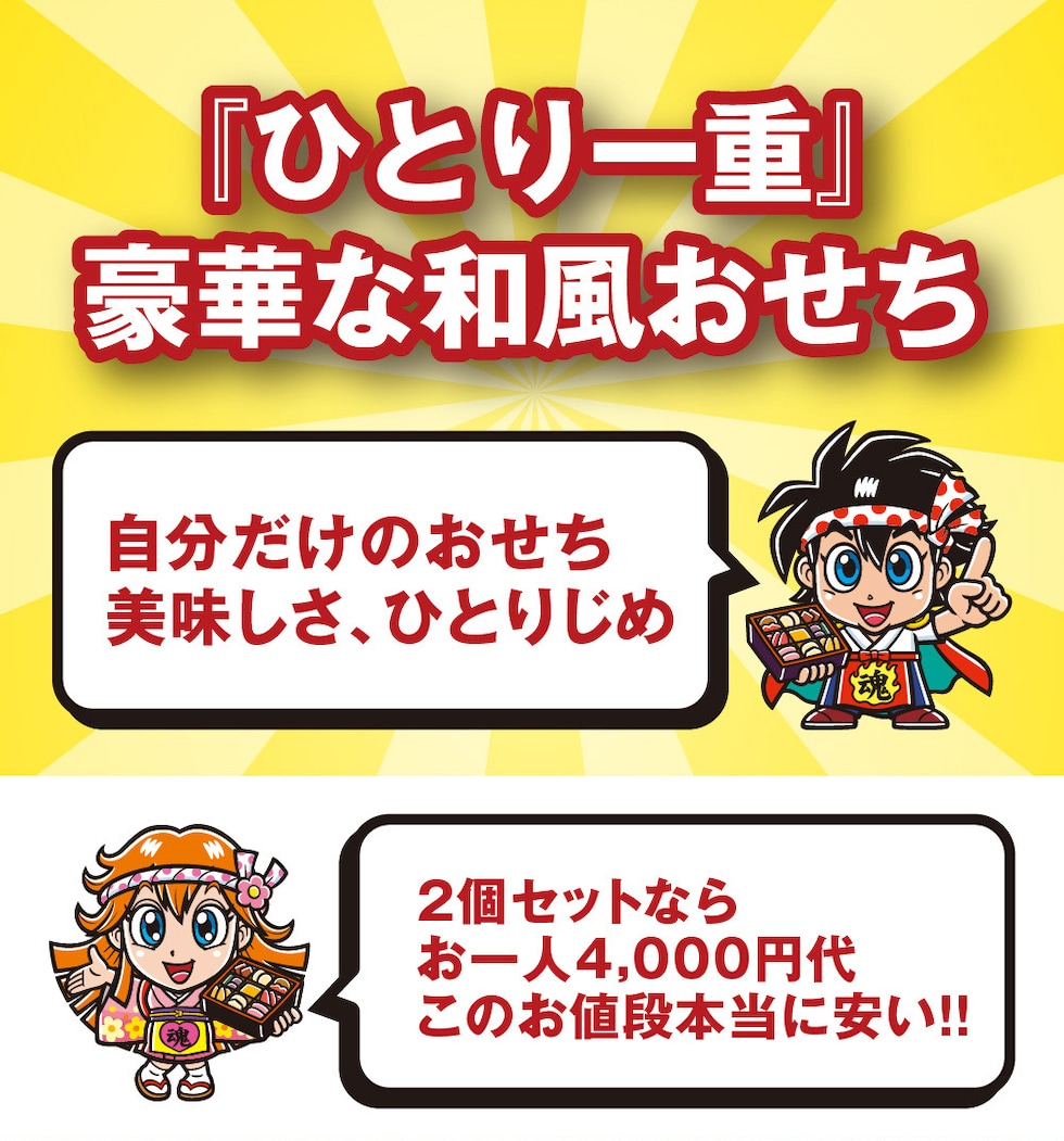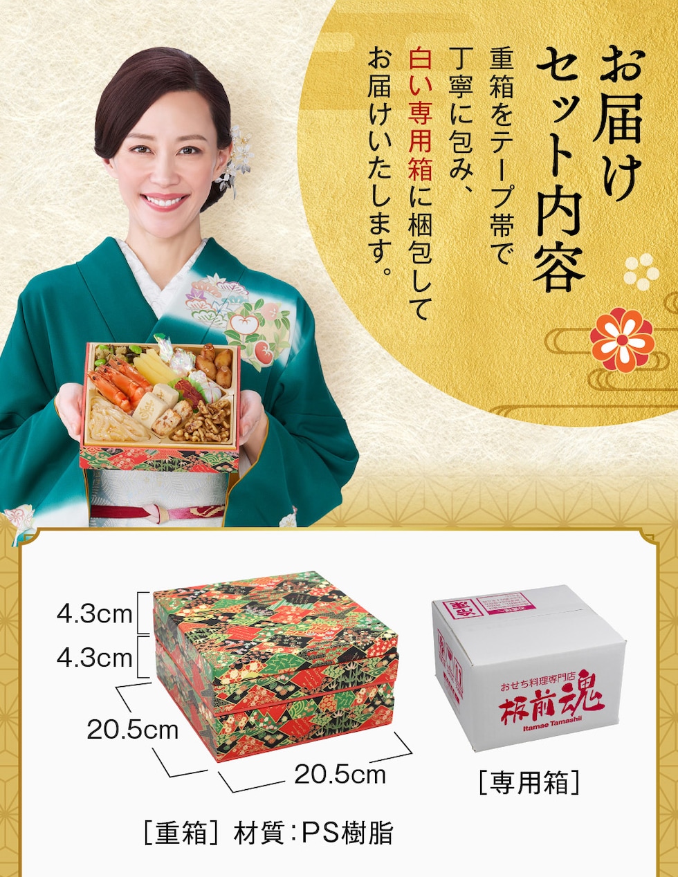 板前魂のおせち料理は、函館、小樽 、仙台、 築地 、山梨、金沢、浜松、 京都 、下関、 博多 、鹿児島など日本や海外の産地をまわり厳選した食材を使用し、有名店やホテルで修行したシェフや繁盛店を営む板長といった4人の匠が監修しています。