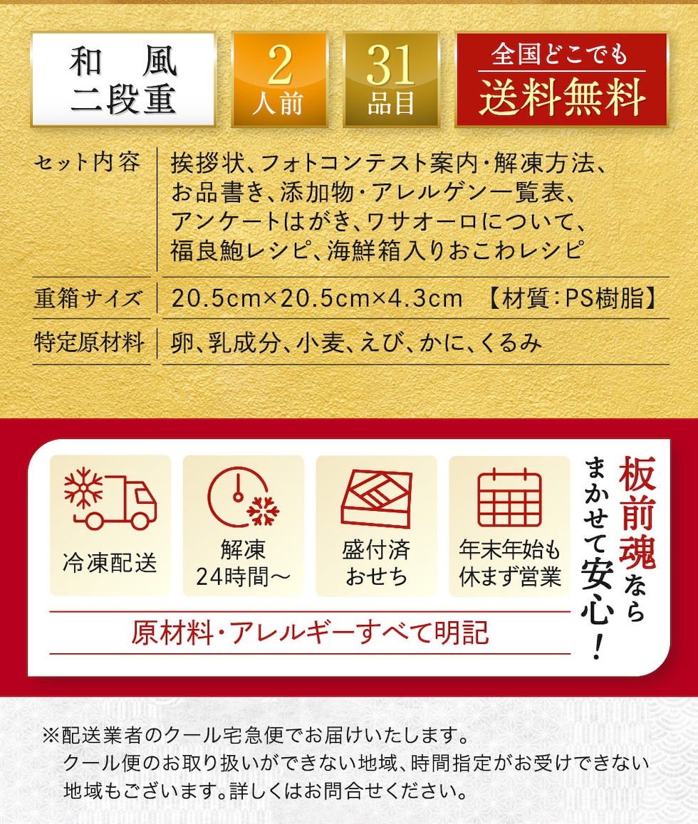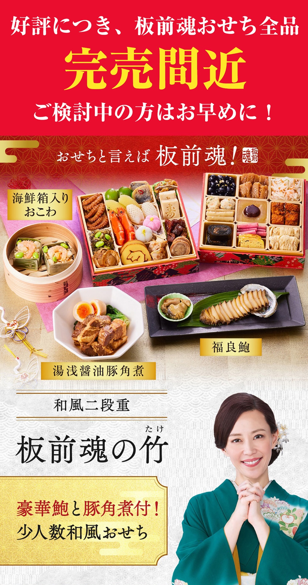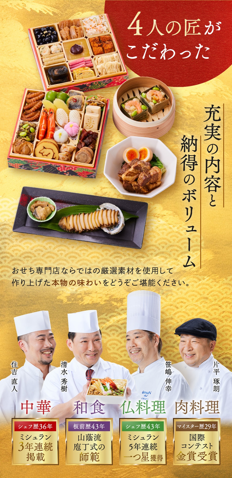 板前魂のおせち料理は、函館、小樽 、仙台、 築地 、山梨、金沢、浜松、 京都 、下関、 博多 、鹿児島など日本や海外の産地をまわり厳選した食材を使用し、有名店やホテルで修行したシェフや繁盛店を営む板長といった4人の匠が監修しています。