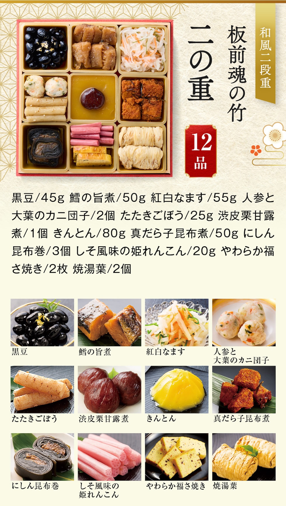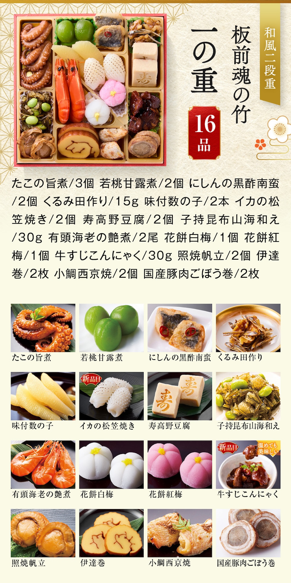 【一の重】たこの旨煮/若桃甘露煮/にしんの黒酢南蛮/くるみ田作り/味付数の子/イカの松笠焼き/寿高野豆腐/子持昆布山海和え/有頭海老の艶煮/花餅白梅/花餅紅梅/牛すじこんにゃく/照焼帆立/伊達巻/小鯛西京焼/国産豚肉ごぼう巻