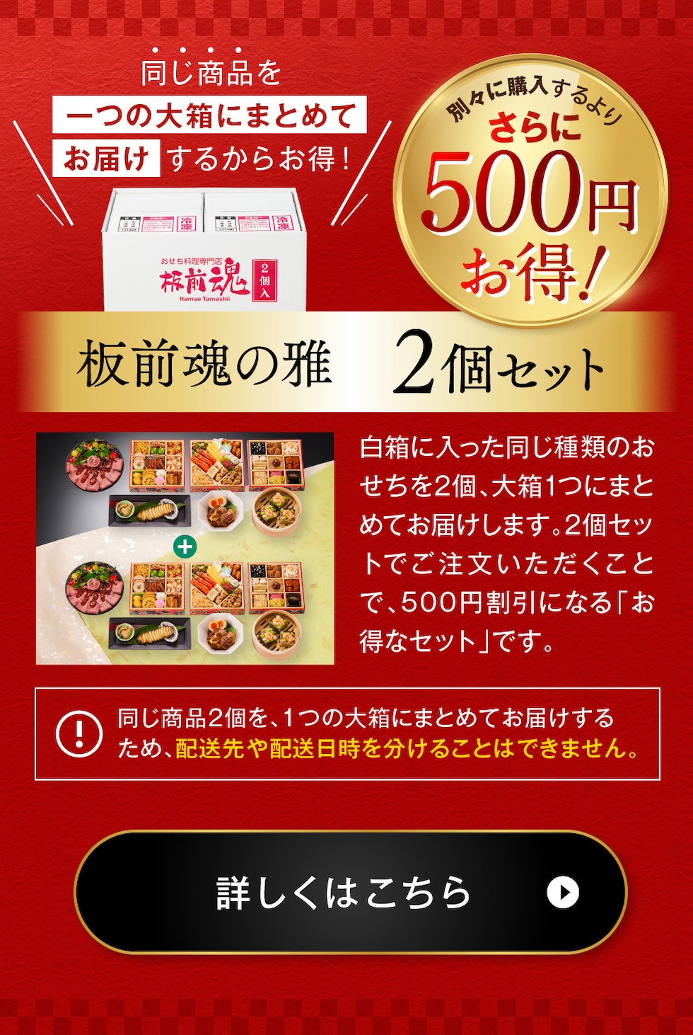 板前魂のおせち料理は、函館、小樽 、仙台、 築地 、山梨、金沢、浜松、 京都 、下関、 博多 、鹿児島など日本や海外の産地をまわり厳選した食材を使用し、有名店やホテルで修行したシェフや繁盛店を営む板長といった4人の匠が監修しています。