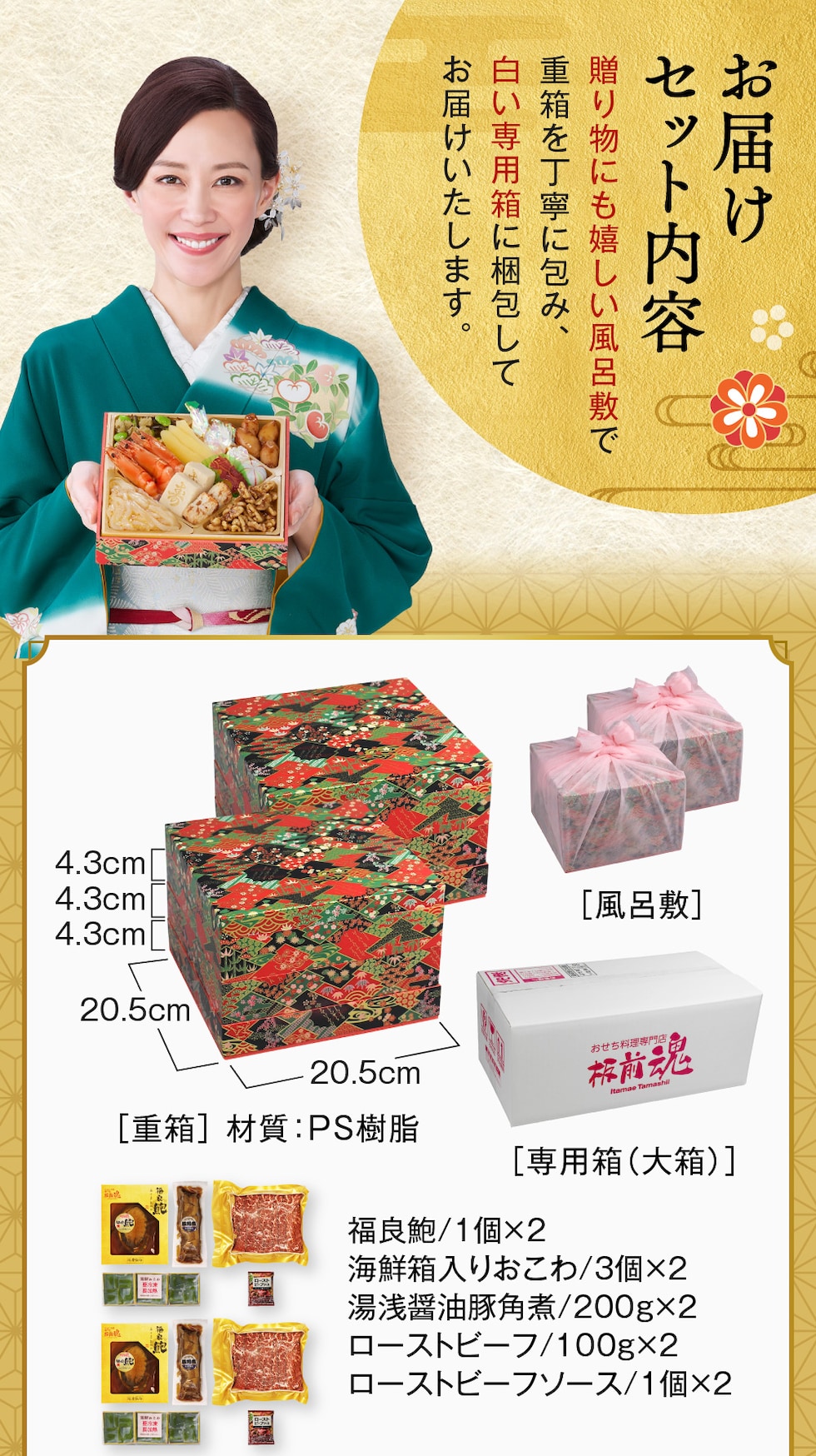 板前魂のおせち料理は、函館、小樽 、仙台、 築地 、山梨、金沢、浜松、 京都 、下関、 博多 、鹿児島など日本や海外の産地をまわり厳選した食材を使用し、有名店やホテルで修行したシェフや繁盛店を営む板長といった4人の匠が監修しています。