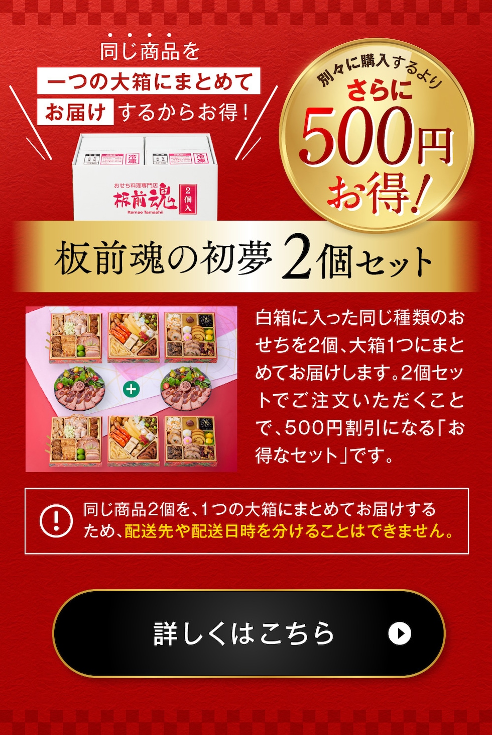 板前魂のおせち料理は、函館、小樽 、仙台、 築地 、山梨、金沢、浜松、 京都 、下関、 博多 、鹿児島など日本や海外の産地をまわり厳選した食材を使用し、有名店やホテルで修行したシェフや繁盛店を営む板長といった4人の匠が監修しています。