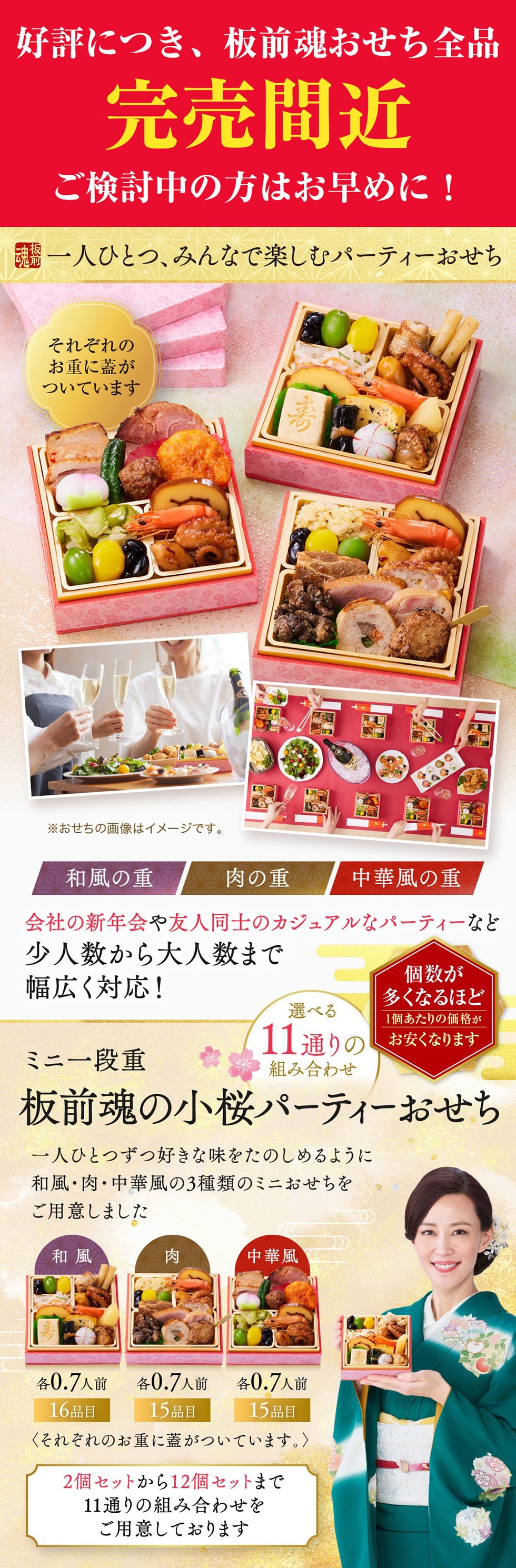少人数から大人数まで、大人も子どもも皆様で味わい楽しめる、家族や口コミで人気のおせちを一段重~七段重まで60種類以上取り揃えました。ご予約受付中。
