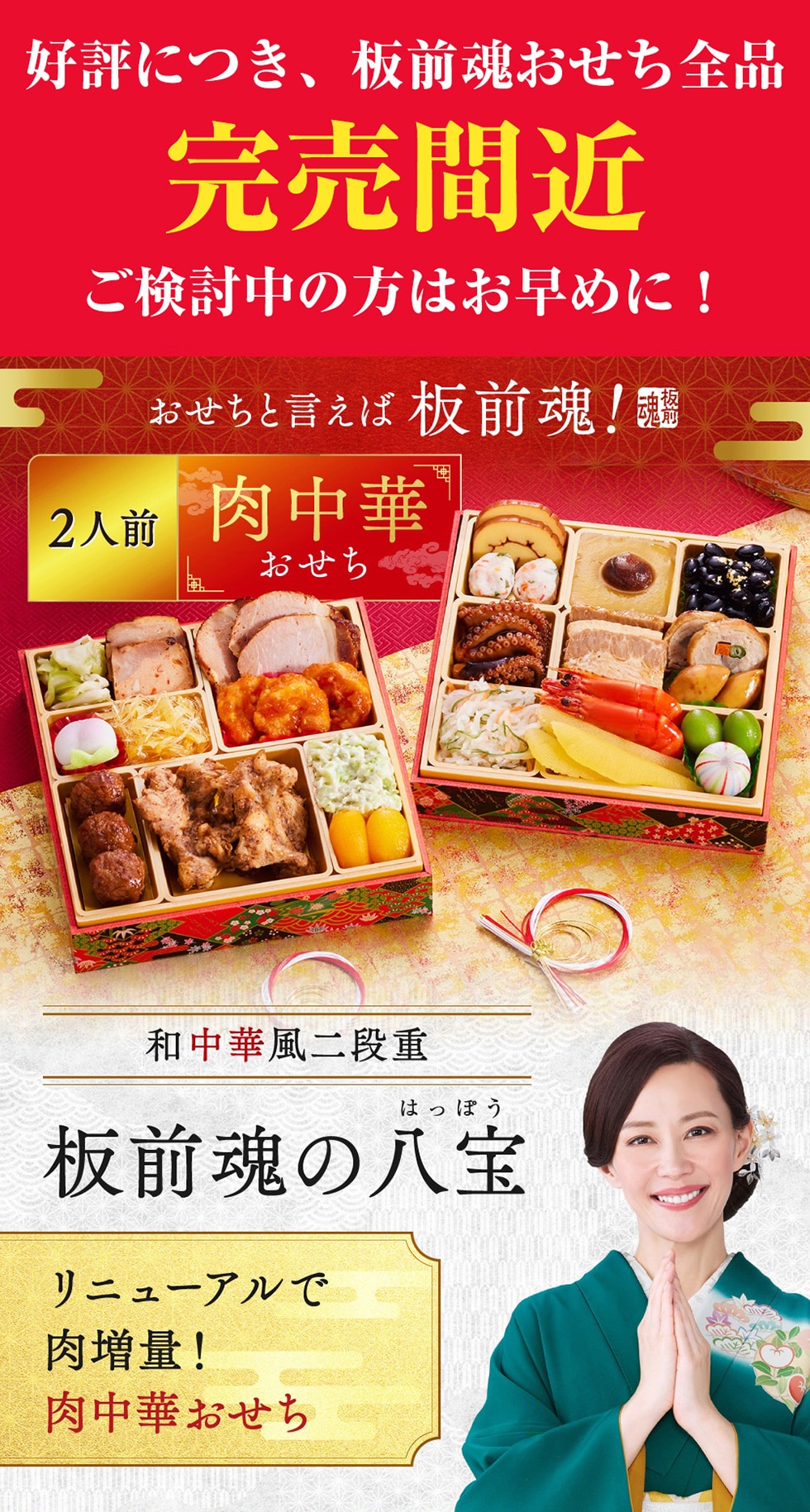 板前魂のおせち料理は、函館、小樽 、仙台、 築地 、山梨、金沢、浜松、 京都 、下関、 博多 、鹿児島など日本や海外の産地をまわり厳選した食材を使用し、有名店やホテルで修行したシェフや繁盛店を営む板長といった4人の匠が監修しています。