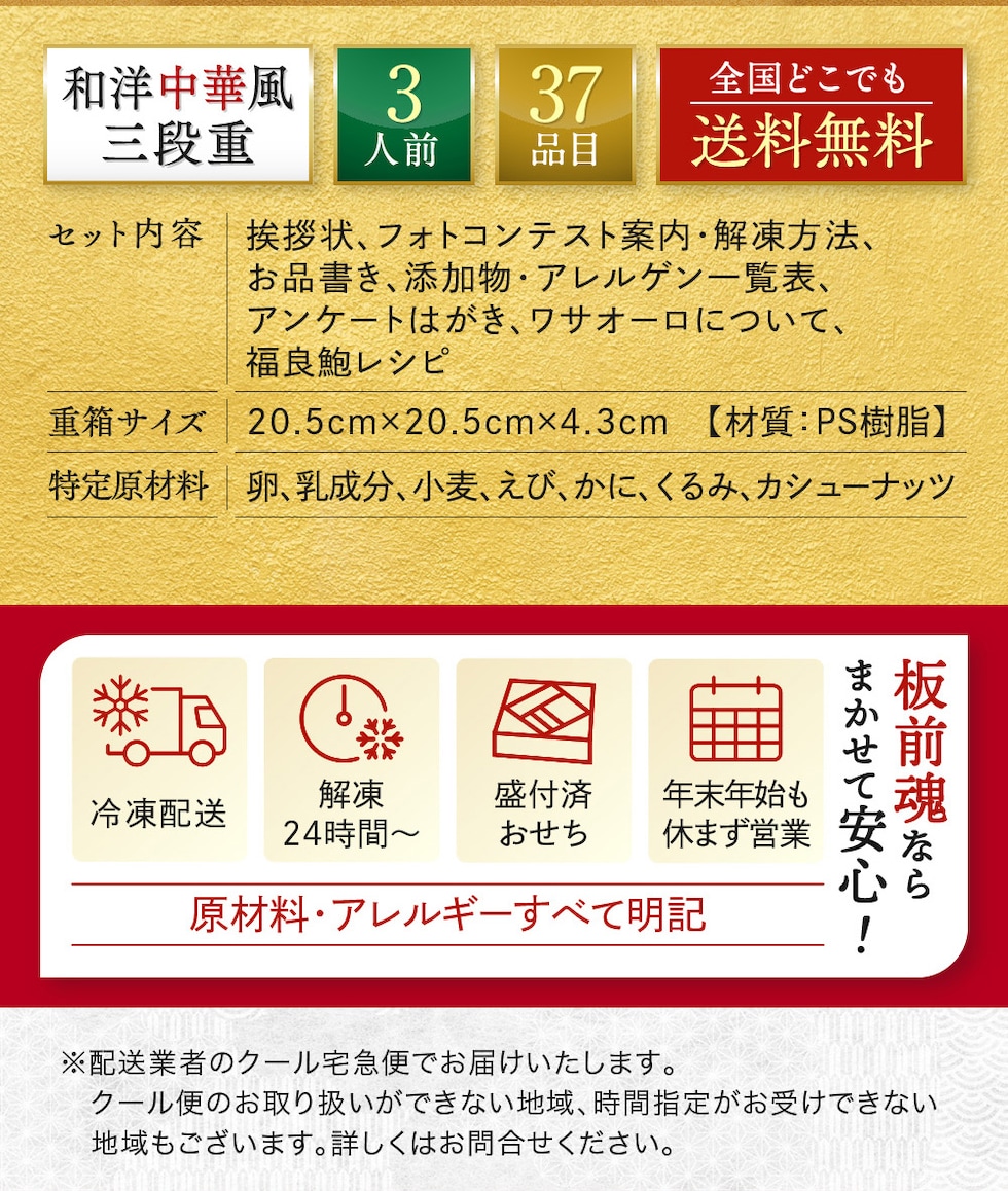 板前魂のおせち料理は、函館、小樽 、仙台、 築地 、山梨、金沢、浜松、 京都 、下関、 博多 、鹿児島など日本や海外の産地をまわり厳選した食材を使用し、有名店やホテルで修行したシェフや繁盛店を営む板長といった4人の匠が監修しています。