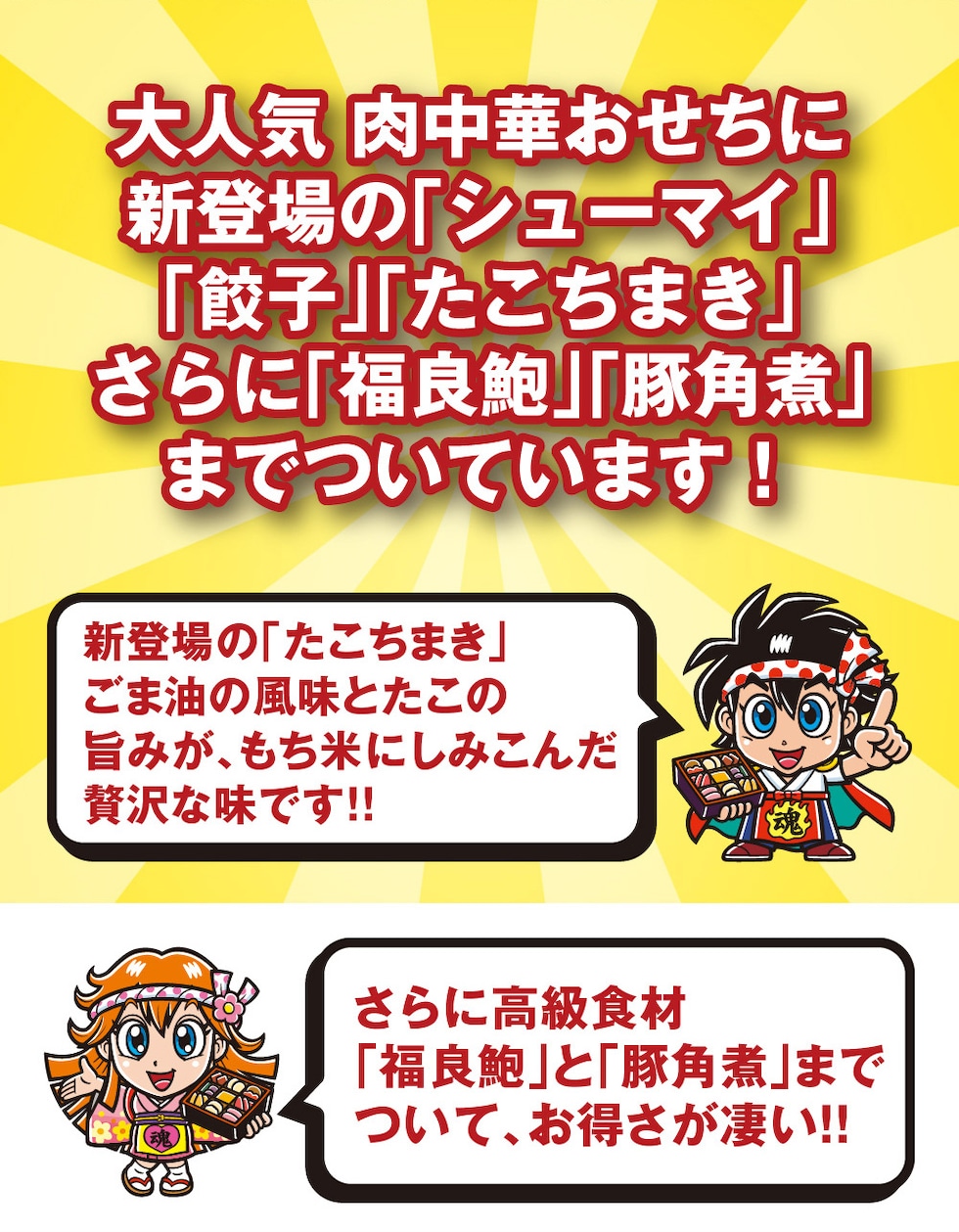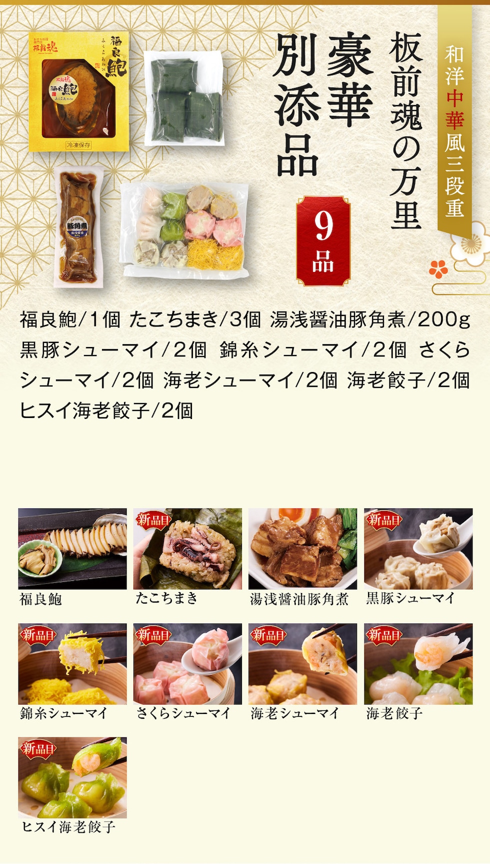 【別添品】福良鮑/たこちまき/湯浅醤油豚角煮/黒豚シューマイ/錦糸シューマイ/さくらシューマイ/海老シューマイ/海老餃子/ヒスイ海老餃子