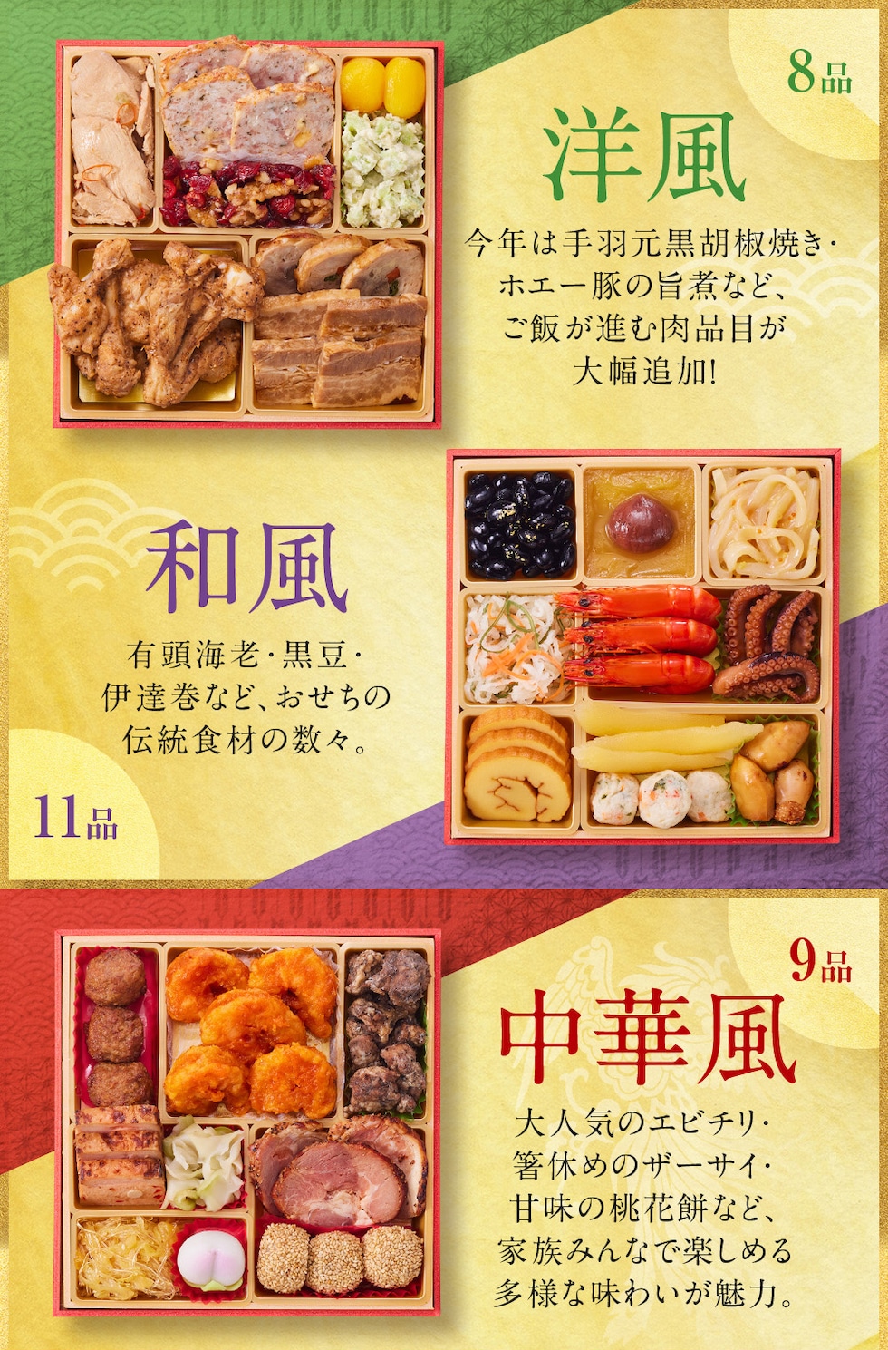 少人数から大人数まで、大人も子どもも皆様で味わい楽しめる、家族や口コミで人気のおせちを一段重~七段重まで60種類以上取り揃えました。ご予約受付中。