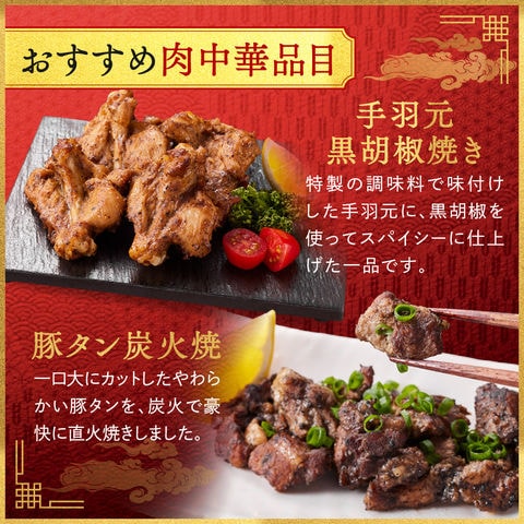 【二の重】黒糖黒酢の国産肉団子/海老のチリソース煮/豚タン炭火焼/鶏中華テリーヌ/あっさりザーサイ/国産黒糖焼き豚/ふかひれ風中華くらげ/桃花餅/胡麻団子