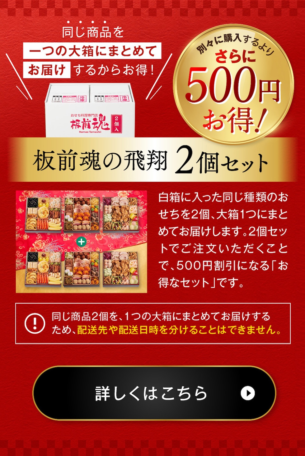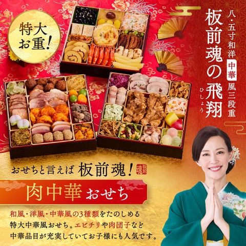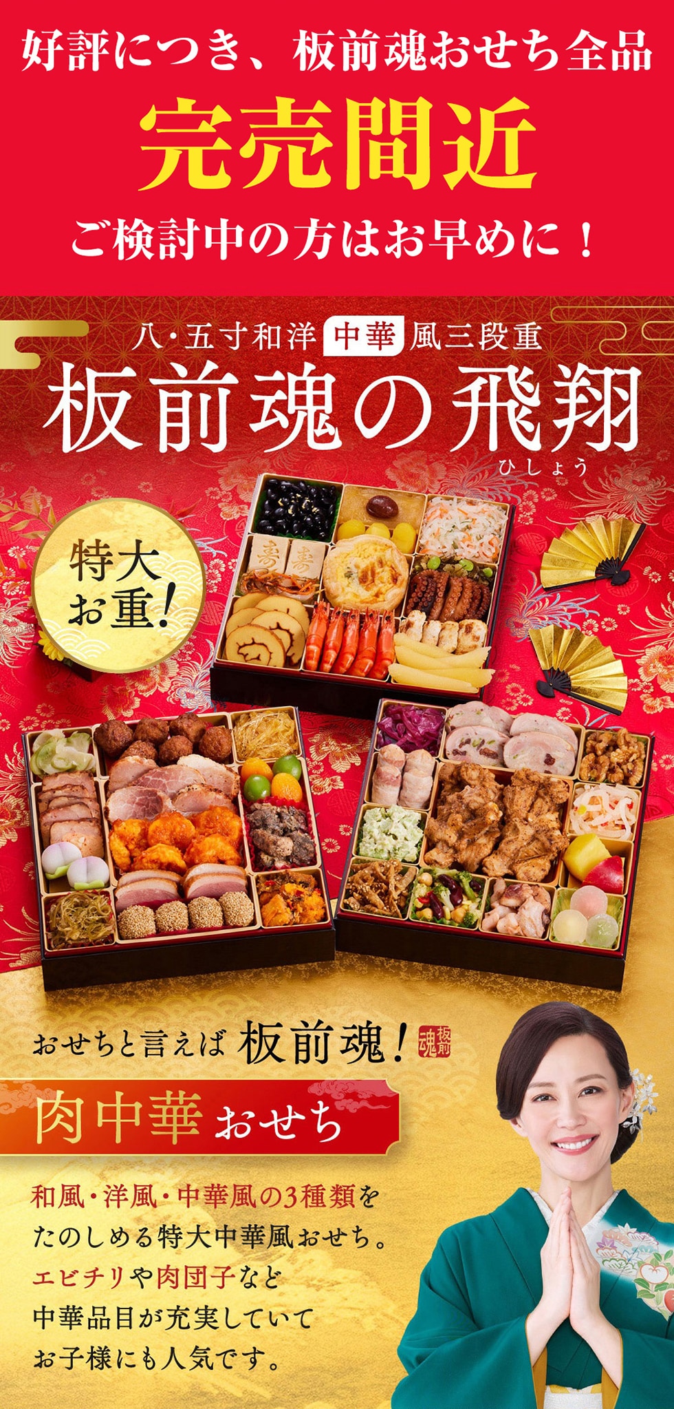 板前魂のおせち料理は、函館、小樽 、仙台、 築地 、山梨、金沢、浜松、 京都 、下関、 博多 、鹿児島など日本や海外の産地をまわり厳選した食材を使用し、有名店やホテルで修行したシェフや繁盛店を営む板長といった4人の匠が監修しています。