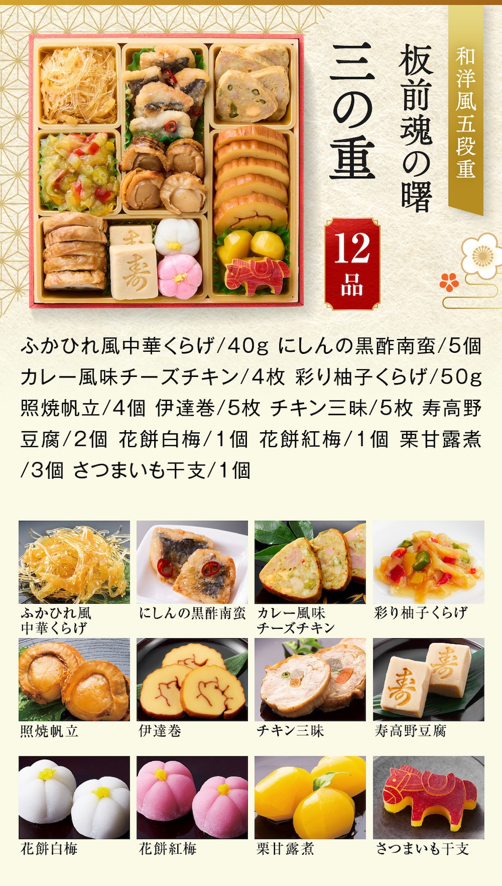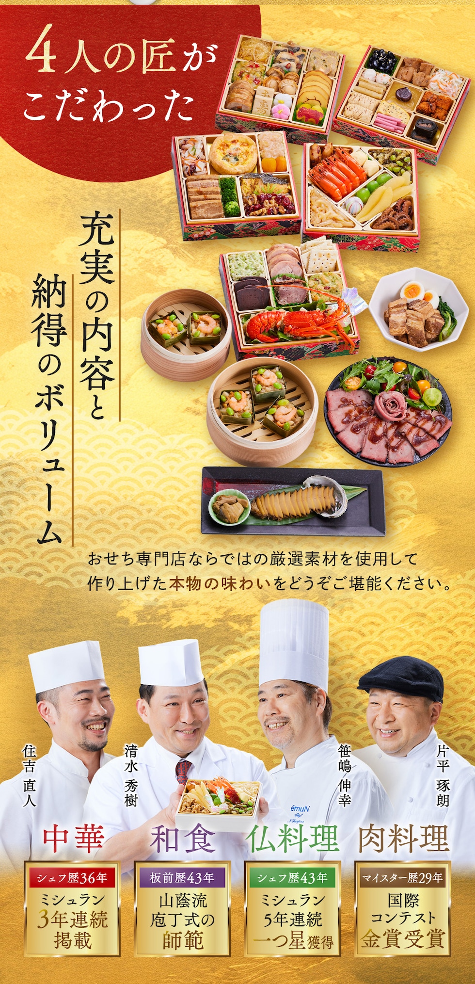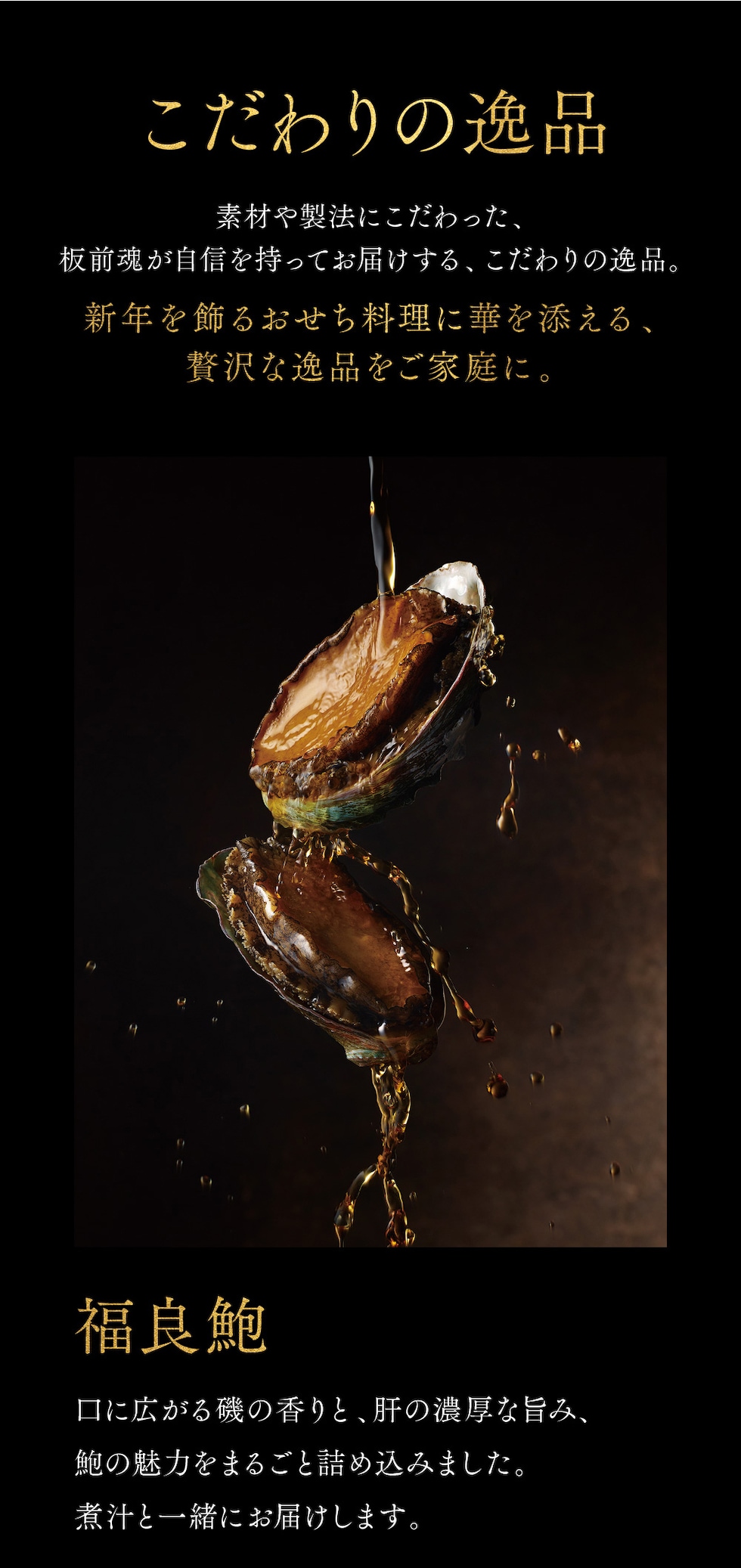 板前魂のおせち料理は、函館、小樽 、仙台、 築地 、山梨、金沢、浜松、 京都 、下関、 博多 、鹿児島など日本や海外の産地をまわり厳選した食材を使用し、有名店やホテルで修行したシェフや繁盛店を営む板長といった4人の匠が監修しています。