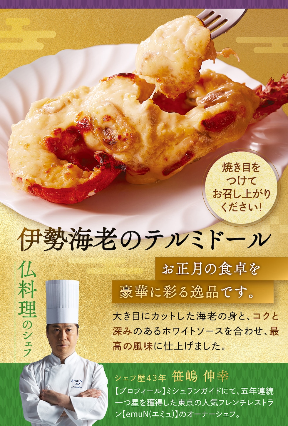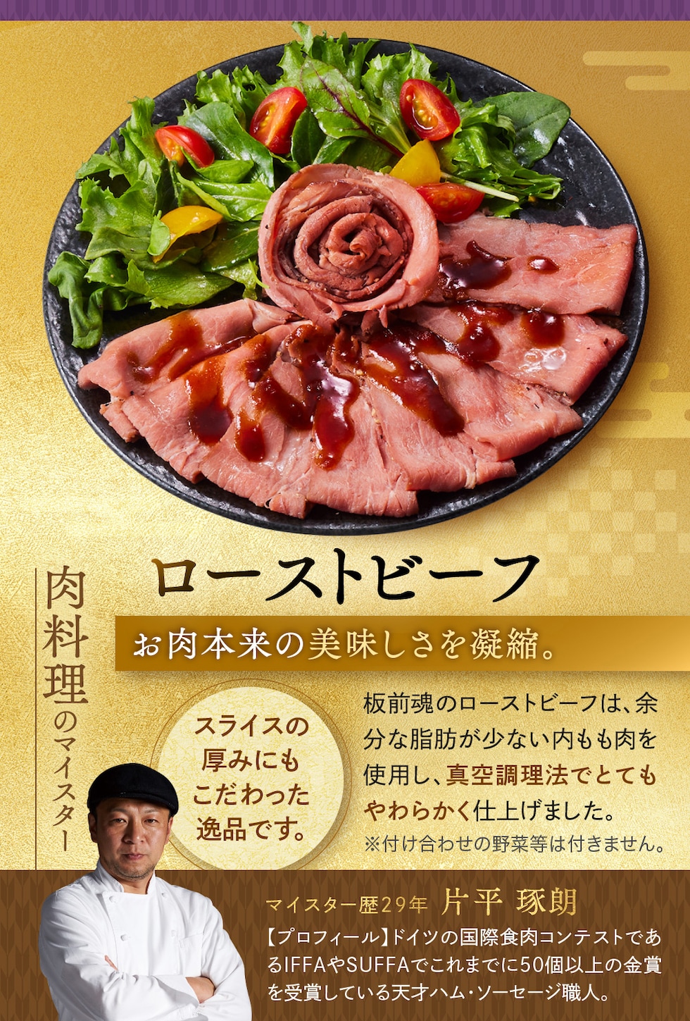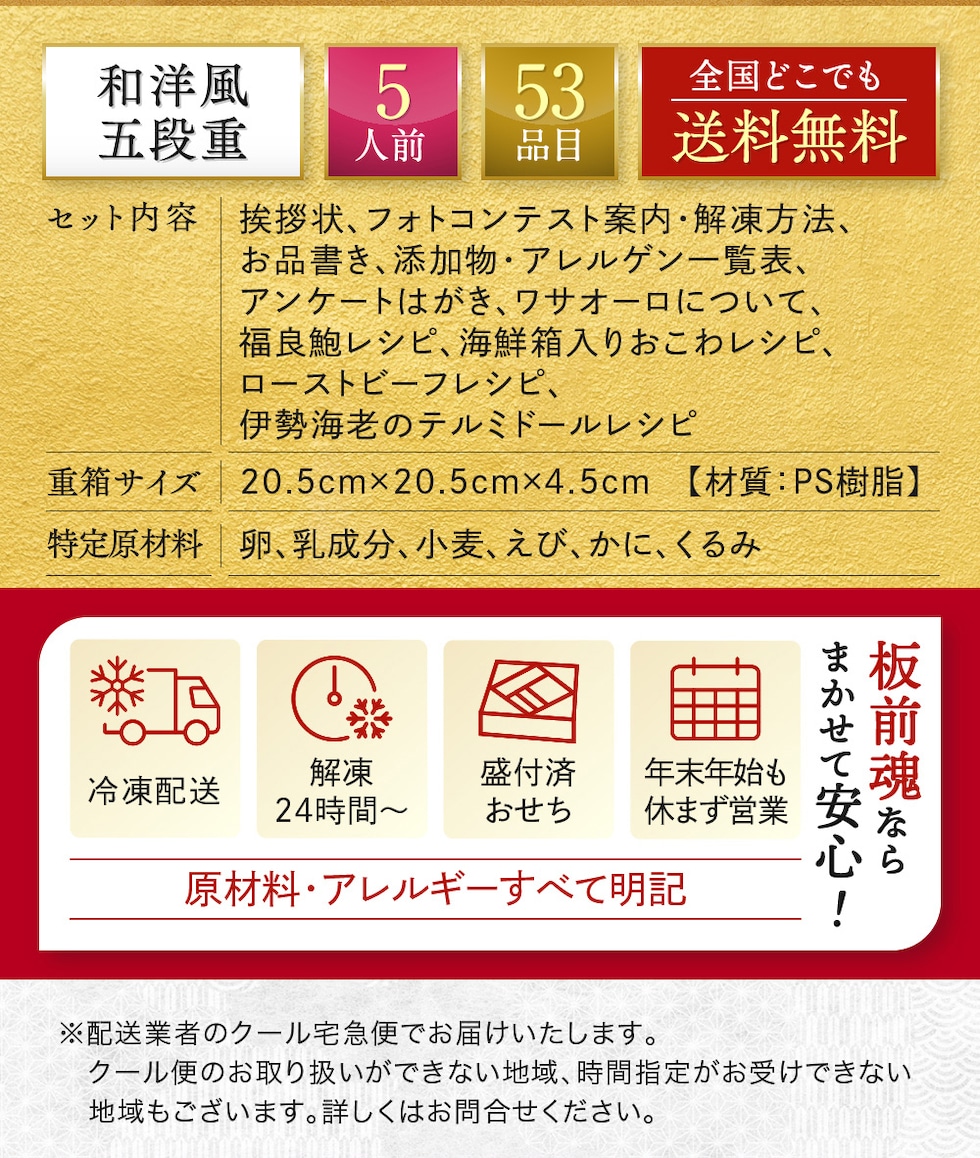 板前魂のおせち料理は、函館、小樽 、仙台、 築地 、山梨、金沢、浜松、 京都 、下関、 博多 、鹿児島など日本や海外の産地をまわり厳選した食材を使用し、有名店やホテルで修行したシェフや繁盛店を営む板長といった4人の匠が監修しています。