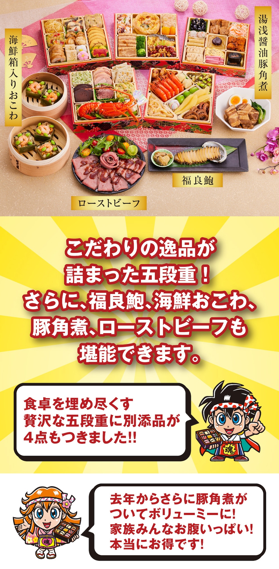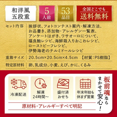 おせち 2026 予約 お節 料理「板前魂の曙」 鮑 豚角煮 ローストビーフ 海鮮おこわ 付き 伊勢海老のテルミドール 入り 和洋風 五段重 53品目 5人前 御節 送料無料 和風 洋風 2025 おせち料理