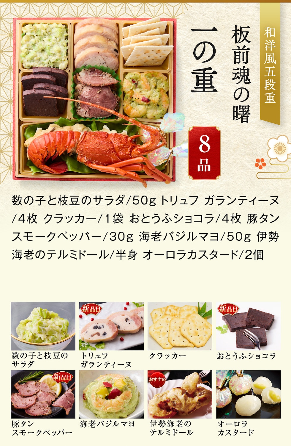【一の重】数の子と枝豆のサラダ/トリュフ ガランティーヌ/クラッカー/おとうふショコラ/豚タンスモークペッパー/海老バジルマヨ/伊勢海老のテルミドール/オーロラカスタード