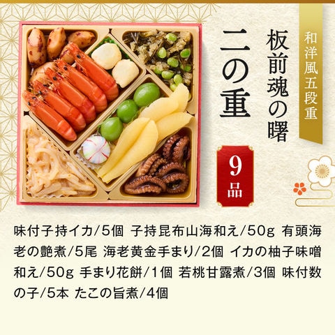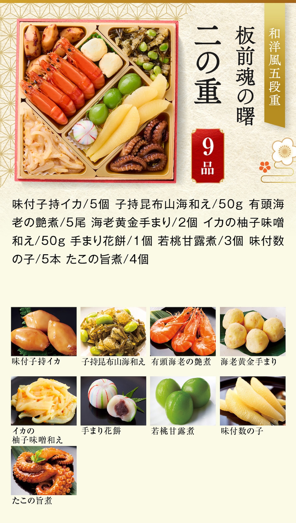 【二の重】味付子持イカ/子持昆布山海和え/有頭海老の艶煮/海老黄金手まり/イカの柚子味噌和え/手まり花餅/若桃甘露煮/味付数の子/たこの旨煮