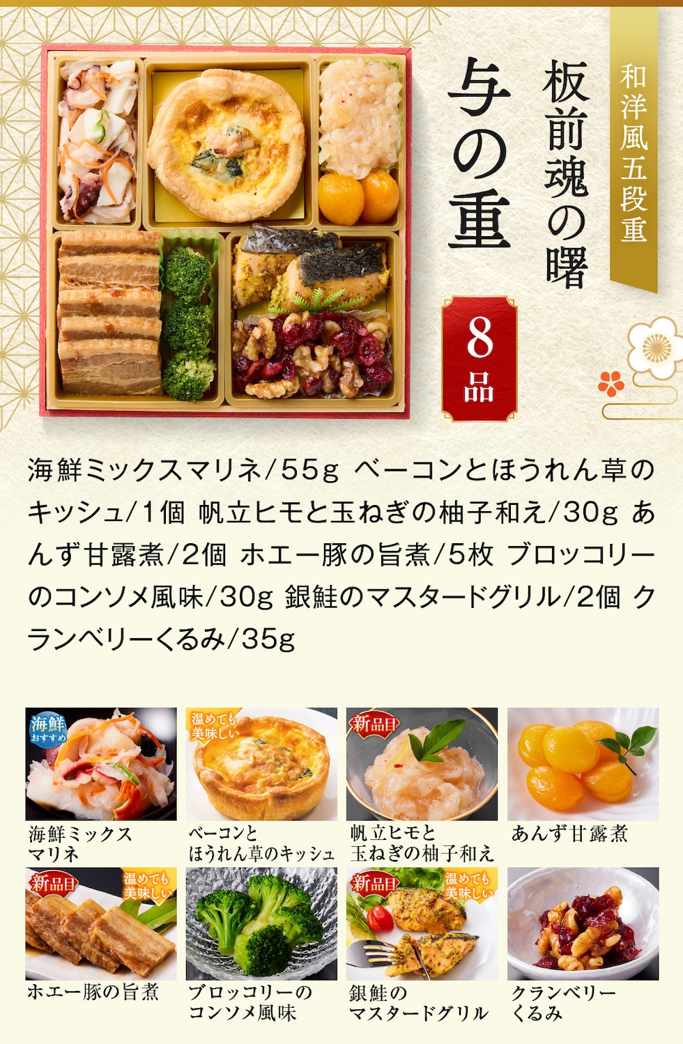 【与の重】海鮮ミックスマリネ/ベーコンとほうれん草のキッシュ/帆立ヒモと玉ねぎの柚子和え/あんず甘露煮/ホエー豚の旨煮/ブロッコリーのコンソメ風味/銀鮭のマスタードグリル/クランベリーくるみ