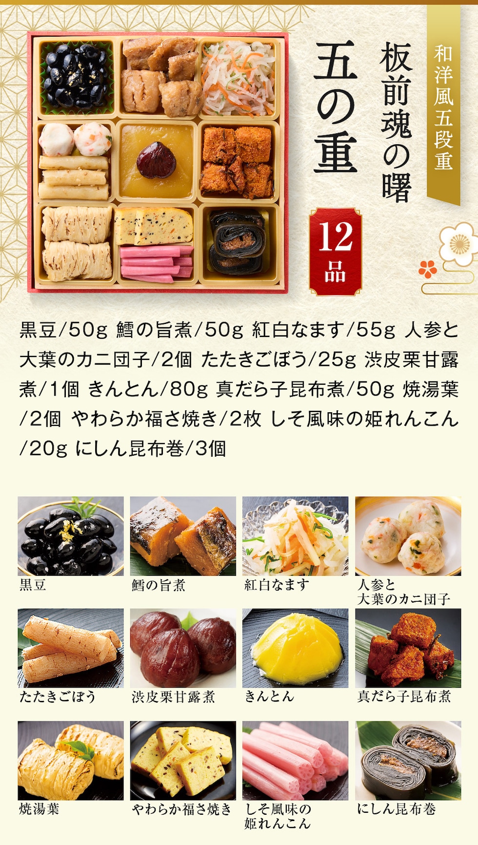 【五の重】黒豆/鱈の旨煮/紅白なます/人参と大葉のカニ団子/たたきごぼう/渋皮栗甘露煮/きんとん/真だら子昆布煮/焼湯葉/やわらか福さ焼き/しそ風味の姫れんこん/にしん昆布巻