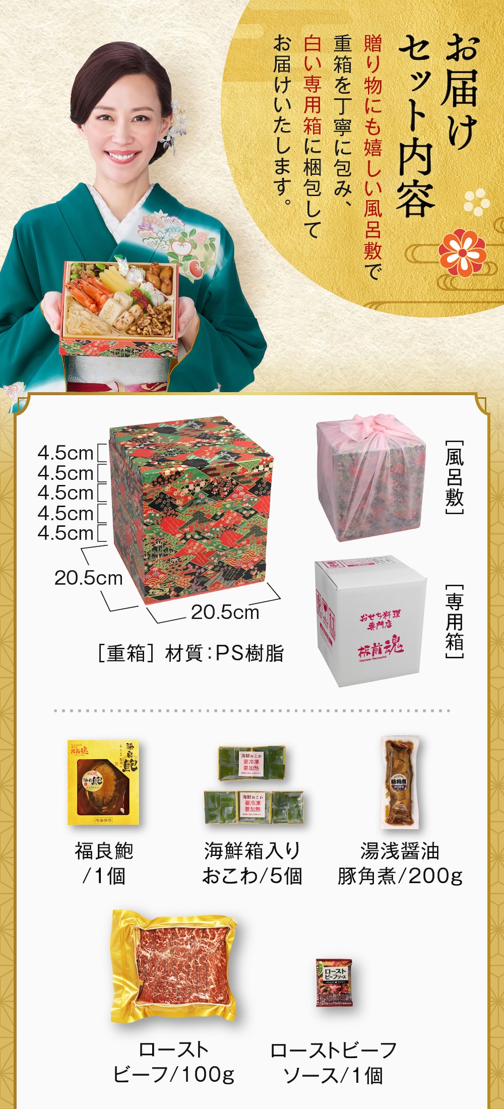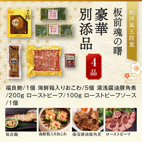 【別添品】福良鮑/海鮮箱入りおこわ/湯浅醤油豚角煮/ローストビーフ/ローストビーフソース