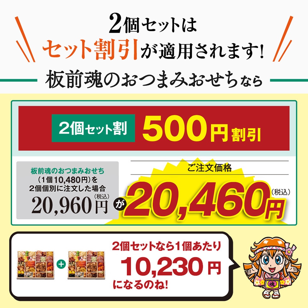 板前魂のおせち料理は、函館、小樽 、仙台、 築地 、山梨、金沢、浜松、 京都 、下関、 博多 、鹿児島など日本や海外の産地をまわり厳選した食材を使用し、有名店やホテルで修行したシェフや繁盛店を営む板長といった4人の匠が監修しています。