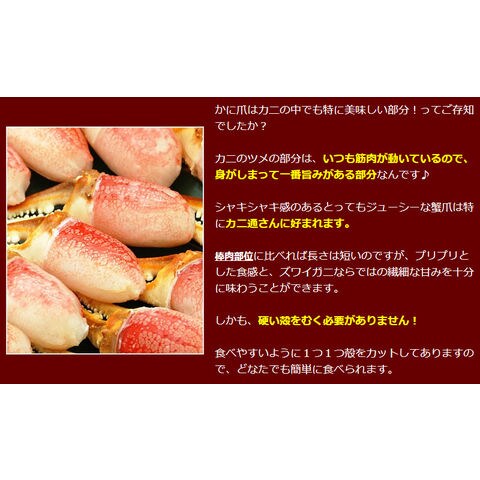 | かに爪はカニの中でも特に美味しい部分!ってご存知でしたか? 蟹のツメの部分はいつも筋肉が動いているので身がしまって一番旨みがある部分なんです♪ シャキシャキ感のあるとってもジューシーな蟹爪は特にカニ通さんに好まれます。 棒肉部位に比べれば長さは短いのですがずわいがにならではの繊細な甘みを十分に味わうことができます。 しかも、硬い殻をむく必要がありません! 食べやすいように1つ1つ殻をカットしてありますので、どなたでも簡単に食べられます。 カニ鍋にして、シメにかに雑炊やラーメンを楽しんだり、しゃぶしゃぶ、バーベキューでの鉄板焼き、カニフライ、ボイルしてシーフードサラダにもどうぞ! |