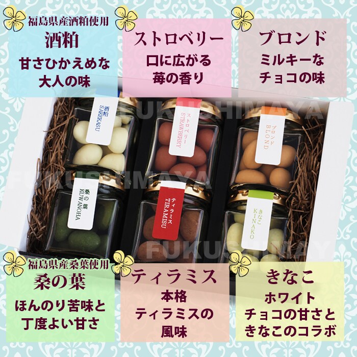 アーモンド(アメリカ)、砂糖、カカオマス(ガーナ)、ココアバター、乳糖、全粉乳、植物性油脂、桑の葉パウダー/乳化剤、香料、(原材料の一部に乳成分・大豆を含む)