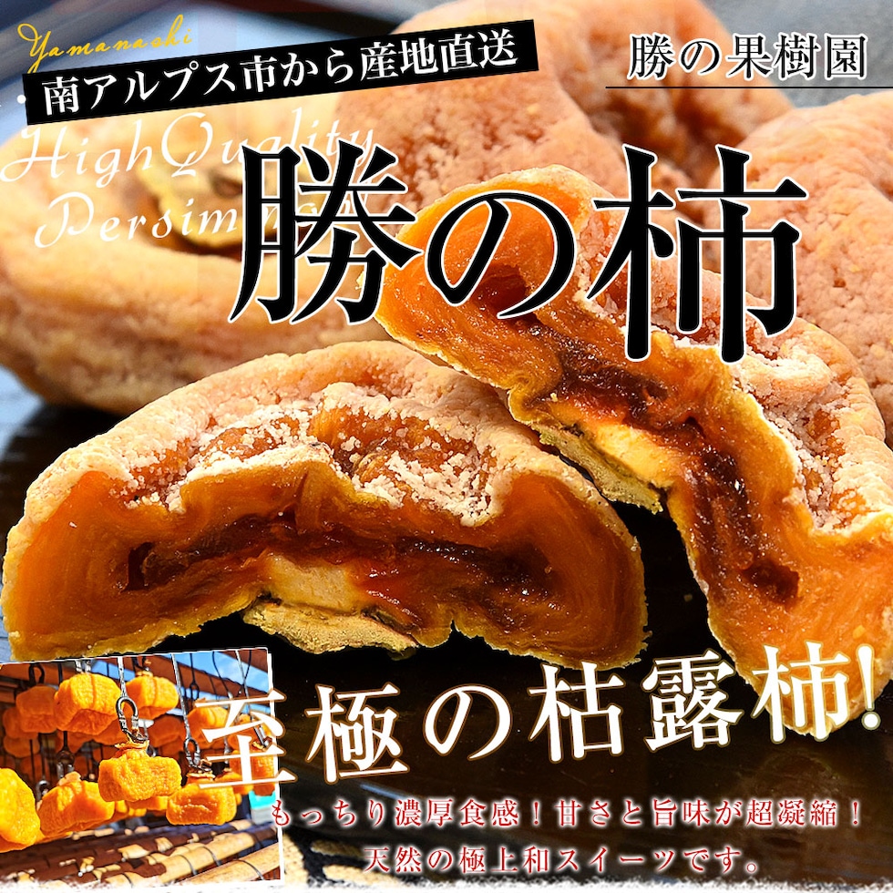 山梨県南アルプス市の勝の果樹園の「勝の柿」。平核無柿を使った、珍しい枯露柿になります。鼻に抜ける柿の熟成された、天然の甘い香り。もっちりとした食感で、甘さと旨味が超凝縮されています。干し柿農家が本当においしいと思う干し柿を作りたい、そんな生産者の熱い思いで完成された逸品です。