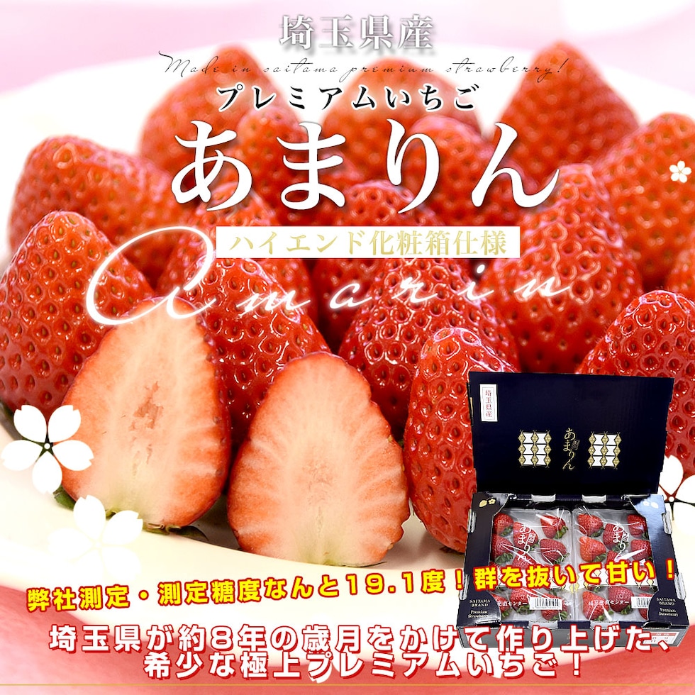 埼玉県が約8年もの歳月をかけて開発した、プレミアムいちご「あまりん」!驚くほどの強い甘み!弊社測定・実測糖度はなんと19.1度も!一度食べたら虜になる、うっとりする甘さです。ギフトにもぴったりな化粧箱に入れてお届けします。
