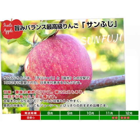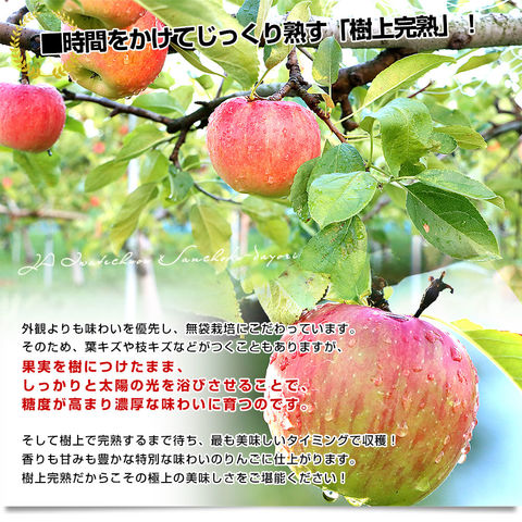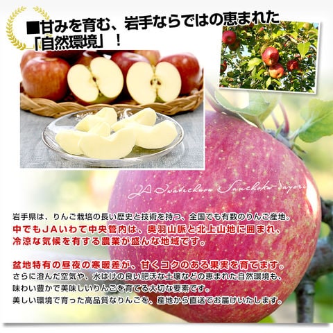 岩手県で太陽の光をたっぷり受けて育った、樹上完熟りんごを産地直送でお届けします。「サンふじ」は歯ごたえが良く甘み抜群のりんご!無袋栽培で育てますので、葉キズや枝キズなどがつくこともありますが、美味しさ抜群なりんごです。