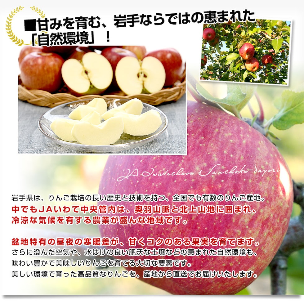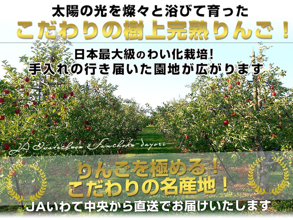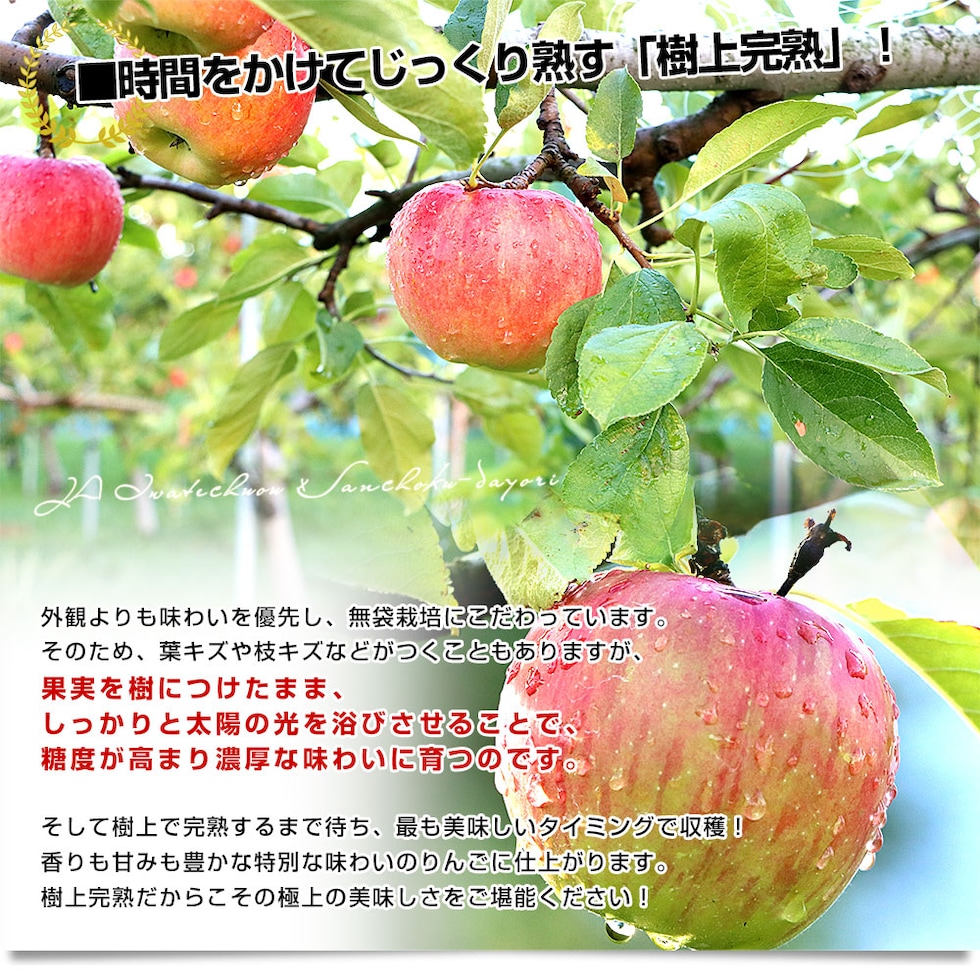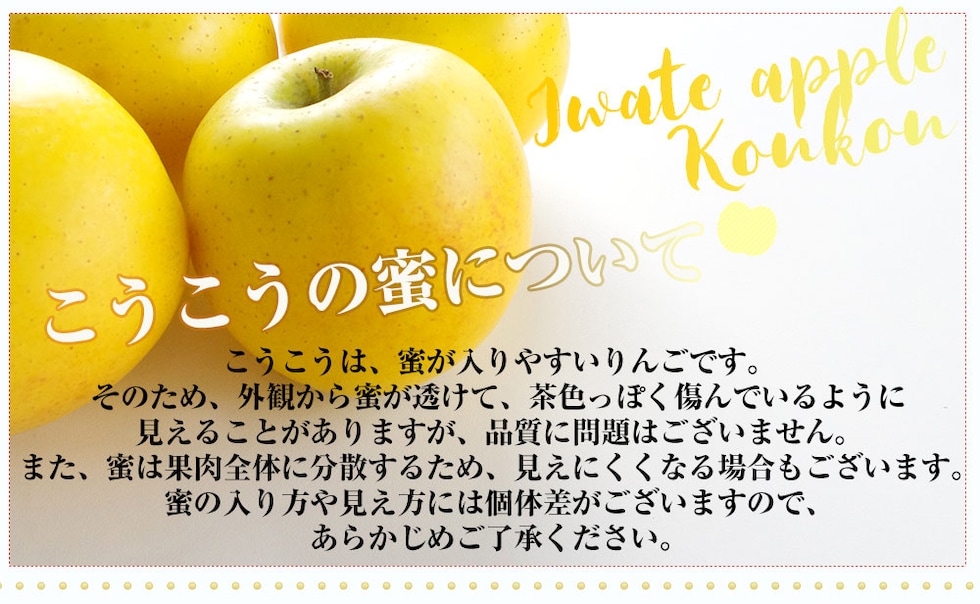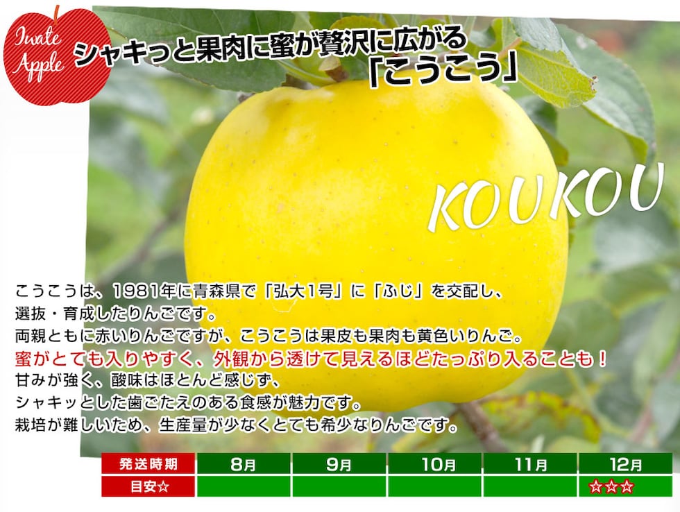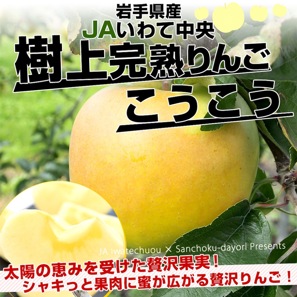 岩手県で太陽の光をたっぷり受けて育った、樹上完熟りんごを産地直送でお届けします。「こうこう」は甘みが強く、シャキっと果肉に蜜がたっぷり入った極旨のりんご!無袋栽培で育てますので、葉キズや枝キズなどがつくこともありますが、美味しさ抜群なりんごです。