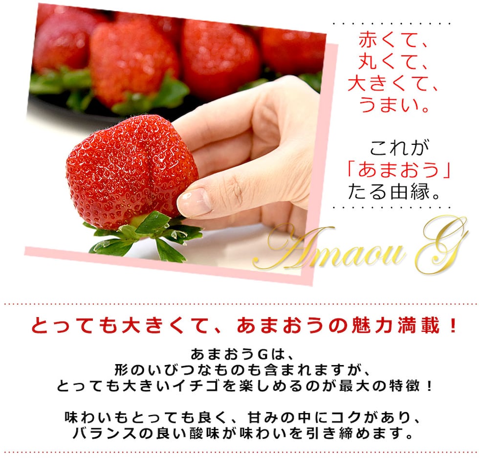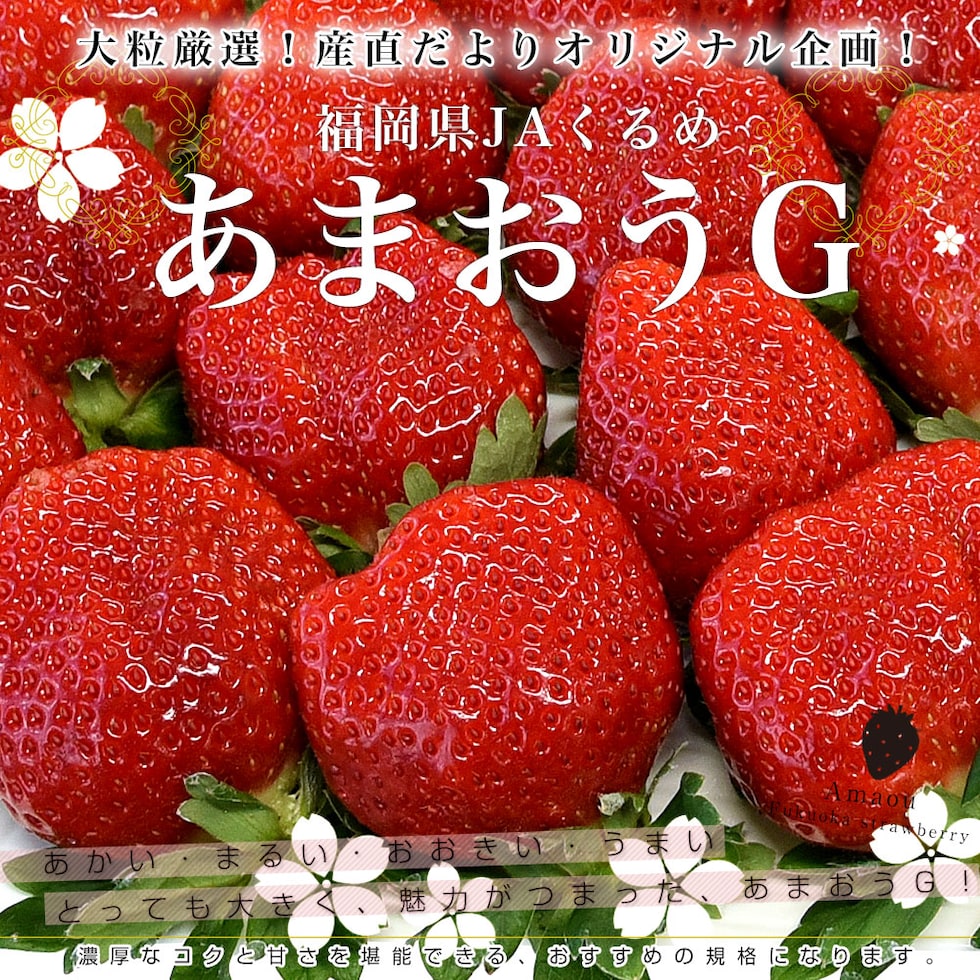 JAくるめ×産直だよりだけのオリジナル企画!農家さん達が求める、苺の傑作品「あまおう」!まあるい形やグローブ形状が特徴のGグレードです。味わいがとってもよく、甘みの中にコクあり、バランスの良い酸味が味わいを引き締めます。甘さが強いと言われる先端部分が多いのも特徴です。