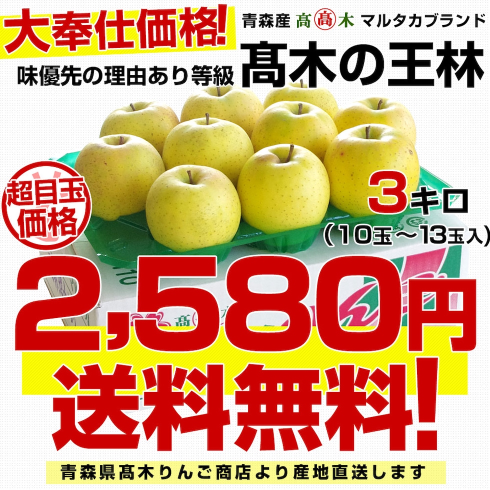 【家計応援価格!】青森県より産地直送 高木商店 マルタカブランド 高木の王林 味優先の理由あり 3キロ (10玉から13玉入) 送料無料 林檎 リンゴ おうりん 津軽