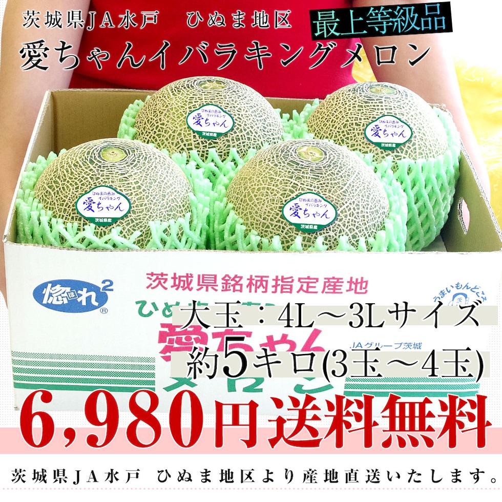 茨城県より産地直送 JA水戸 ひぬま地区 最上等級品 愛ちゃんイバラキングメロン 4Lから3Lサイズ 約5キロ (3玉から4玉) 送料無料 メロン めろん