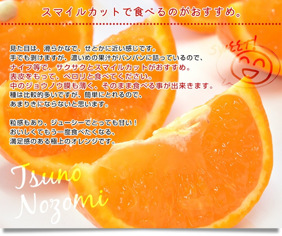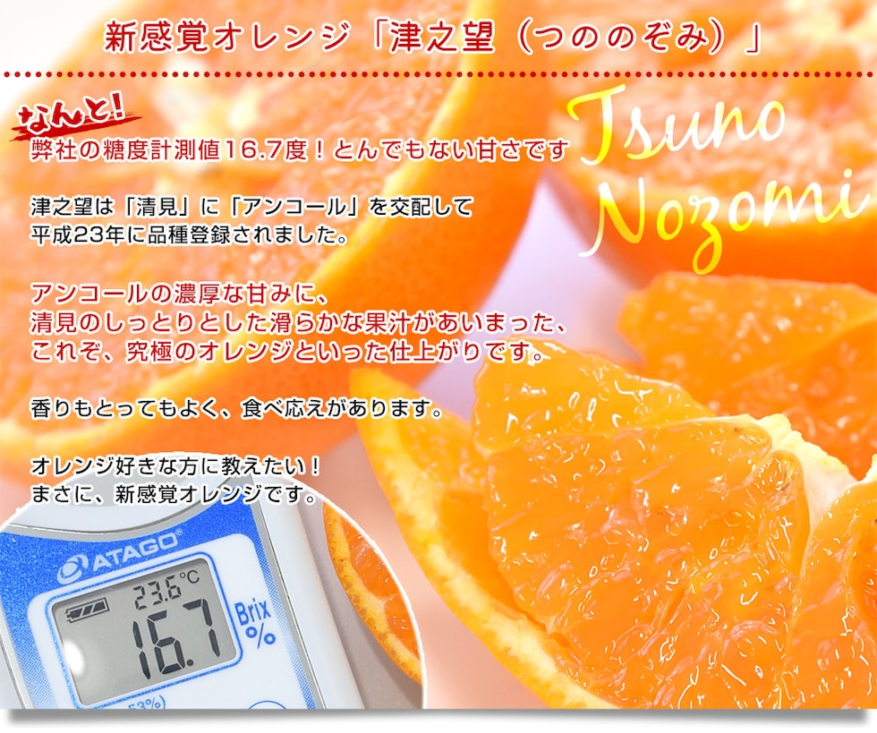 津之望は「清見」に「アンコール」を交配して平成23年に品種登録されました。アンコールの濃厚な甘みに、清見のしっとりとした滑らかな果汁があいまった、これぞ、究極のオレンジといった仕上がりです。香りもとってもよく、食べ応えがあります。