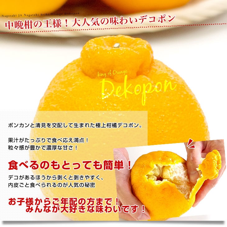 デコポンの名前を語れるのは、糖度13度以上、酸度1%未満のものだけ! 厳しい基準をクリアしたデコポンの品質レベルは、とっても高く、濃厚な甘さを楽しめ、他の柑橘の追随を許さない高級柑橘です。