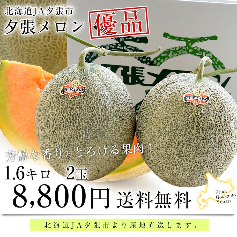 北海道より産地直送 JA夕張市 夕張メロン 優品 2玉(1.6キロ×2玉) 送料無料 ゆうばり 夕張キング めろん お中元 ギフト