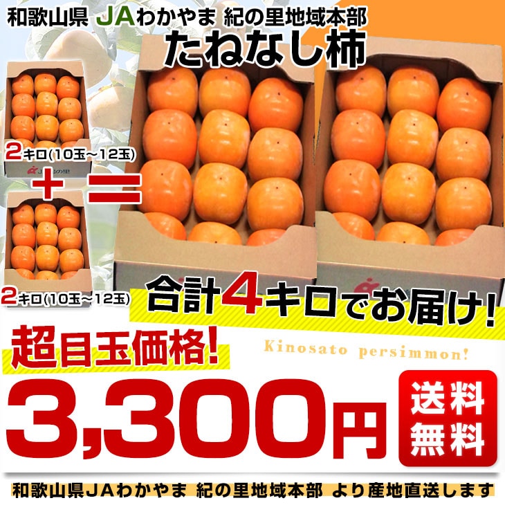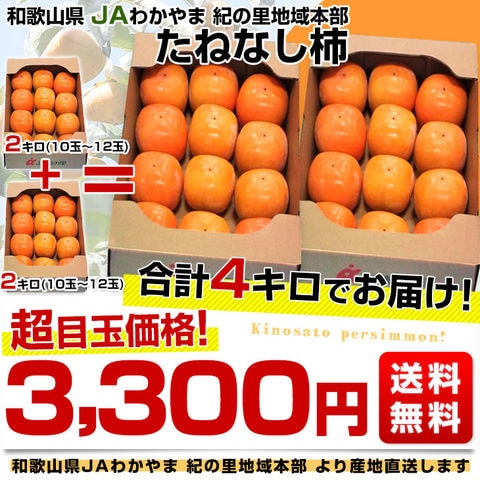 和歌山県より産地直送 JAわかやま 紀の里地域本部 たねなし柿 合計4キロ 2キロ×2箱 (10玉から12玉入り×2箱) カキ かき 柿 送料無料