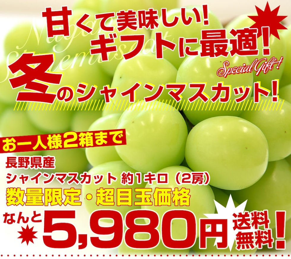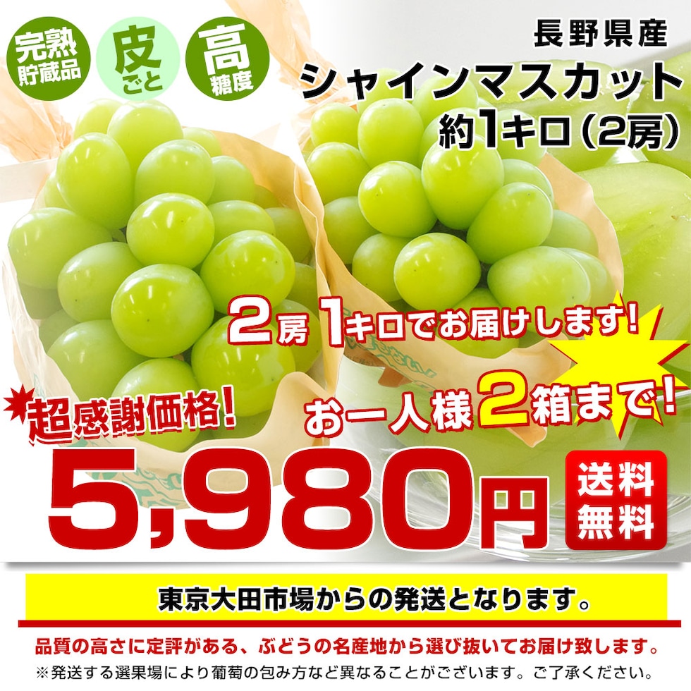 【お歳暮 ギフト】長野県産 シャインマスカット(完熟貯蔵品)約1キロ(2房)送料無料 ぶどう ブドウ 種なしぶどう