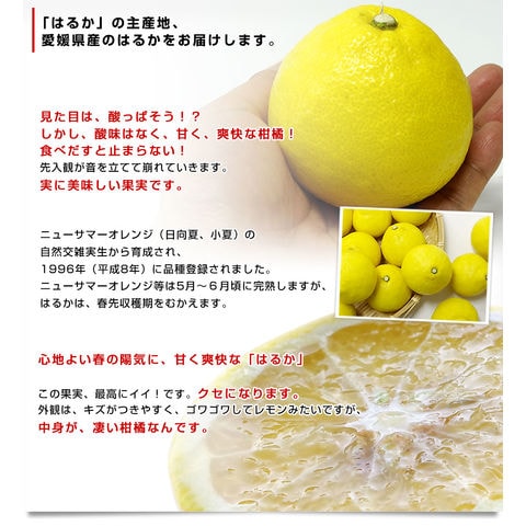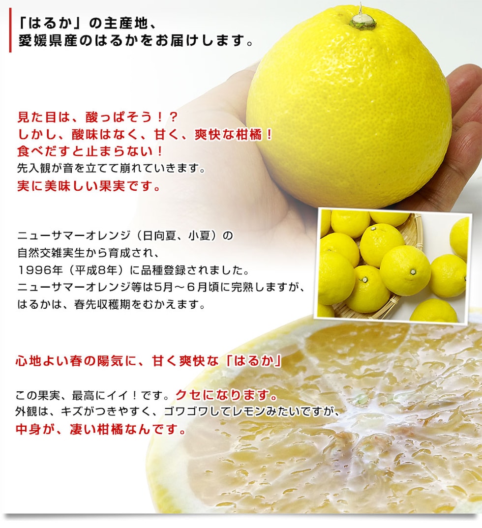 「はるか」は香りがとてもよく、果実の糖度は高めで、酸味が少なくさわやかな風味が特徴です。見た目は酸っぱそうに思えますが、その果肉は上品な甘みを持っています。非常に爽快な柑橘で、食べだすと手が止まらない!おすすめの柑橘です!
