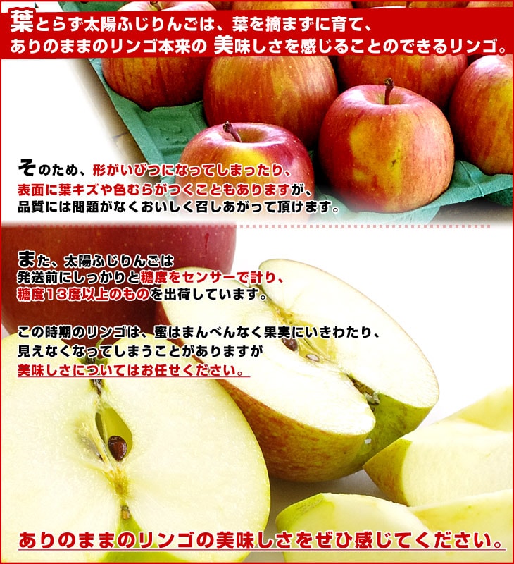 見た目にこだわらず、味重視で育てた葉とらず太陽ふじは、葉を取らないで育て、シャキッと美味しいリンゴを選別しております。多少の色ムラや品質に影響のない小さなキズが入りますが、とっても美味しいのが自慢です。