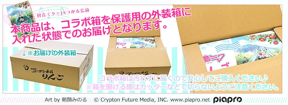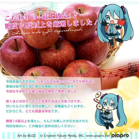 JAつがる弘前×初音ミクコラボ♪甘味・酸味のバランスが良く、シャキッと心地良い歯ごたえの大人気品種、サンふじりんごを限定パッケージBOXでお届けします。味が良いと評判のJAつがる弘前の赤りんご。ご自宅用でもご贈答用でも是非ご利用ください。