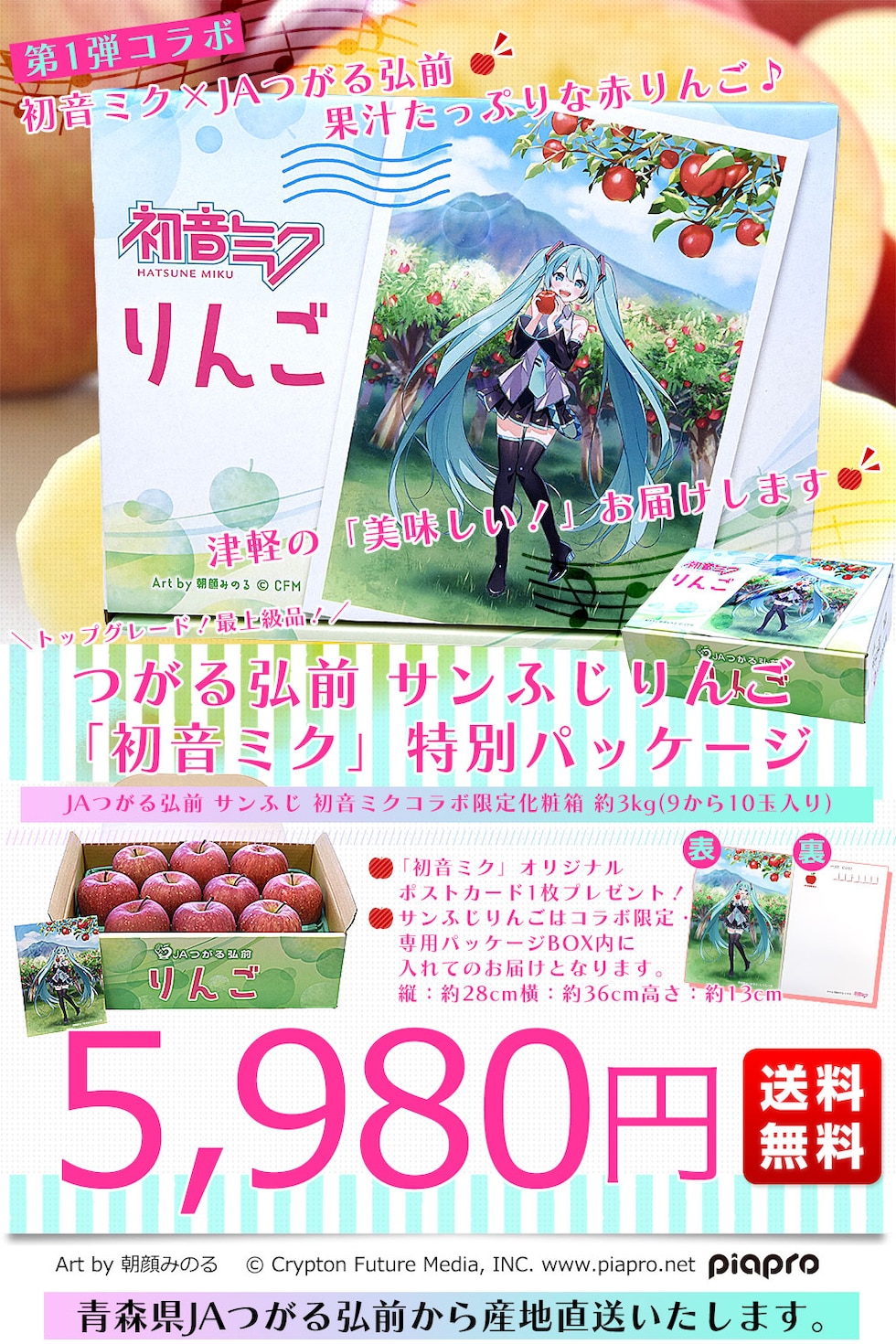 青森県より産地直送 JAつがる弘前 サンふじ 最上級品 初音ミクコラボ限定化粧箱 約3kg(9から10玉入り) 赤りんご リンゴ 送料無料