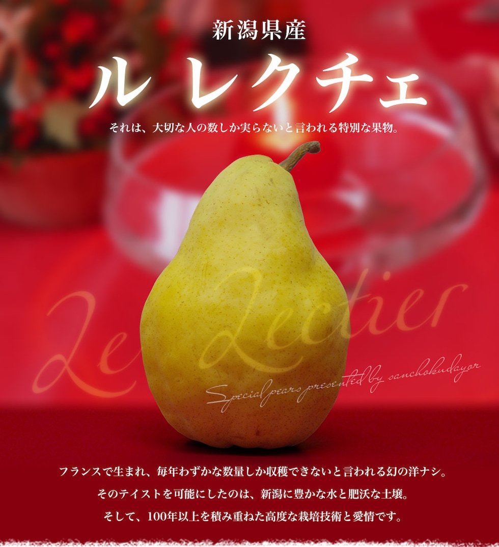 フランスで生まれ、毎年わずかな数量しか収穫できないと言われる幻の洋ナシ。華やな香りと優雅な甘み!そして、とろけおちる果肉。