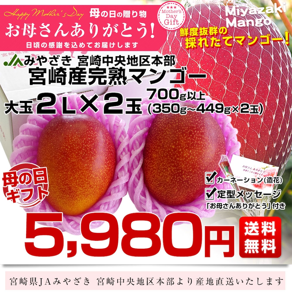 【母の日ギフト】宮崎県より産地直送 JA宮崎中央 宮崎完熟マンゴー 大玉2L×2玉 合計700g以上 (350gから449g×2玉) 送料無料 まんごー 母の日 ははのひ