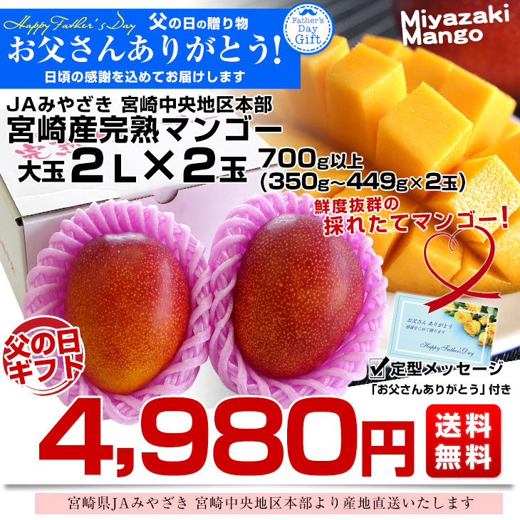 【父の日ギフト】宮崎県より産地直送 JAみやざき 宮崎中央地区本部 完熟マンゴー 大玉2L×2玉 父の日プレゼント 送料無料