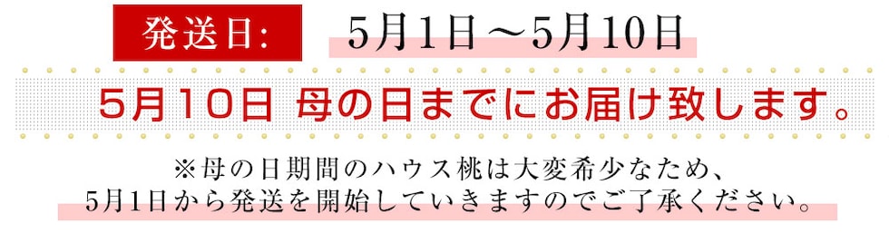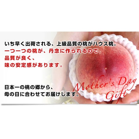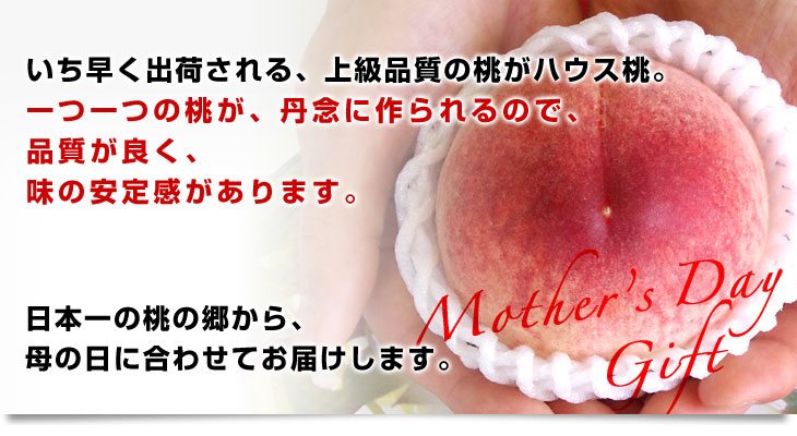 最高級の味わいを産地直送でお届けします。超一流産地で大切に育てられたハウス桃を、母の日に食べ頃となるように収穫しお届けいたします。日頃の感謝を込めて、母の日のプレゼントに最適です。