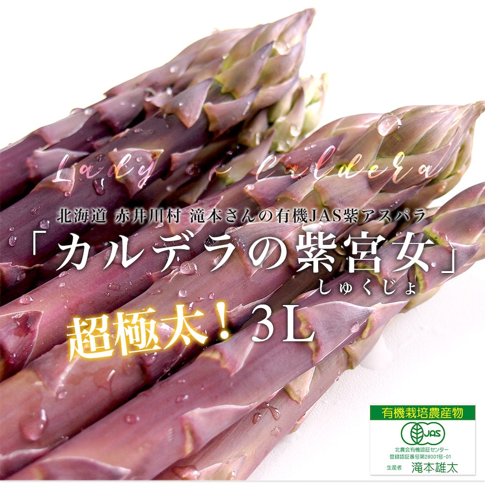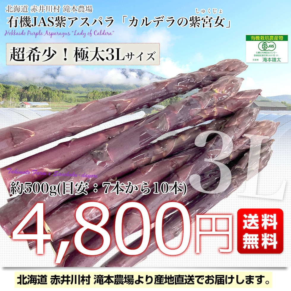 北海道より産地直送 赤井川村滝本農場の有機JAS 紫アスパラ「 カルデラの紫宮女」 3Lサイズ 約500g入り 送料無料 アスパラガス ※クール便発送