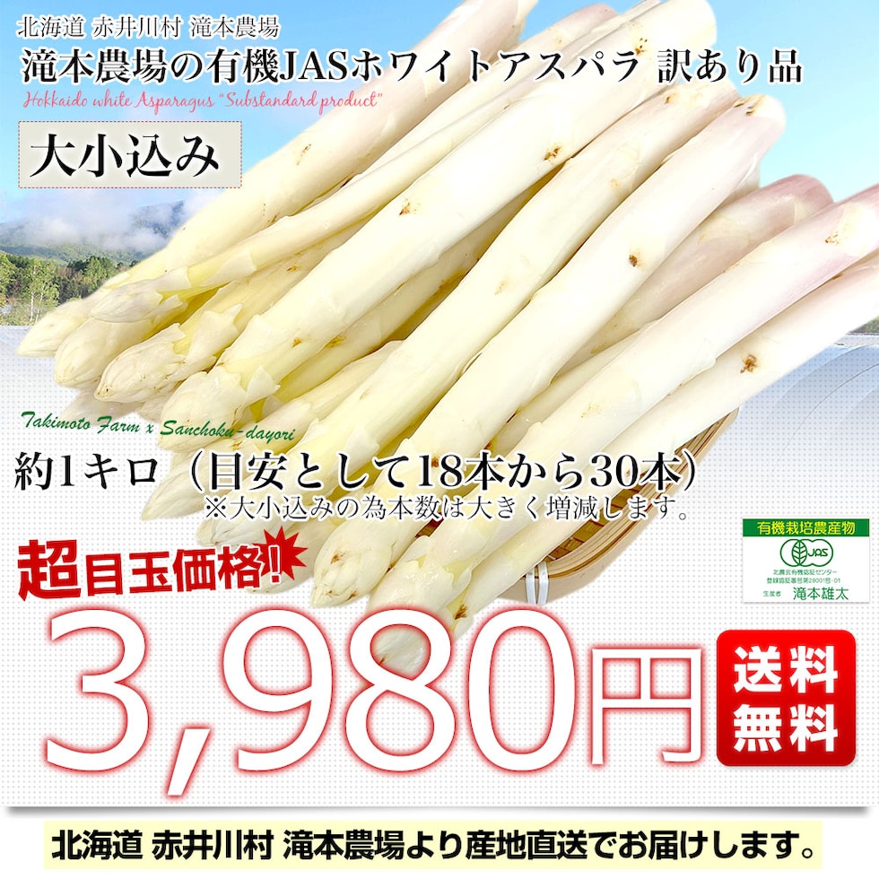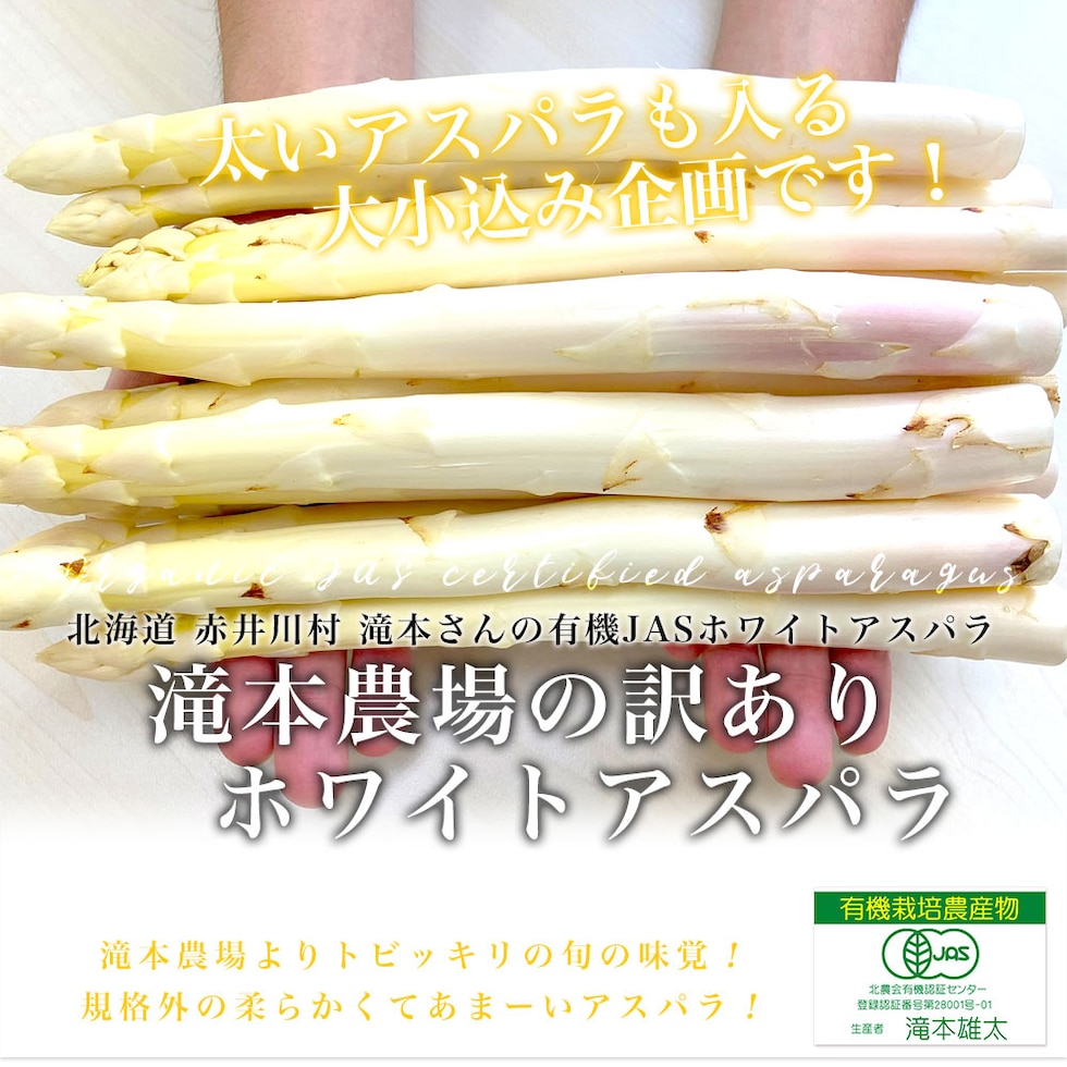 北海道より産地直送 赤井川村 滝本農場の有機JAS認定ホワイトアスパラ 訳あり 大小込み 約1キロ 送料無料 アスパラガス ※クール便発送
