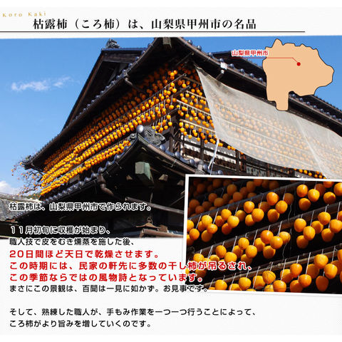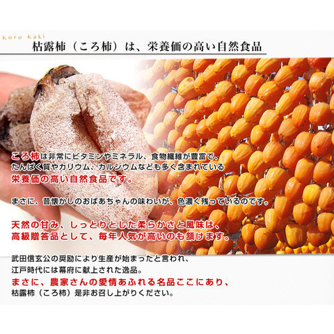 武田信玄が奨励品として、古くから生産され、江戸時代には幕府にも献上されていた逸品。愛情たっぷりに仕上げた山梨松里の枯露柿(干し柿)をお届けします。