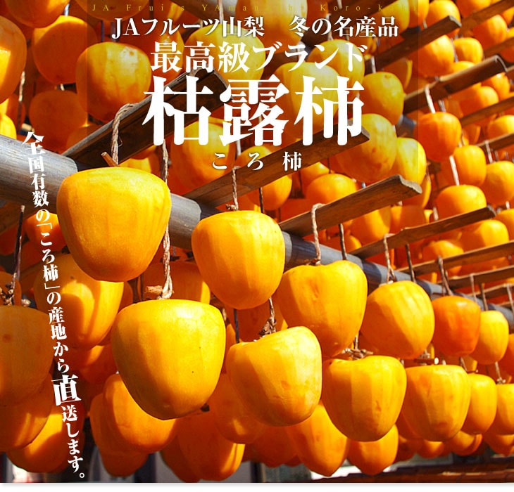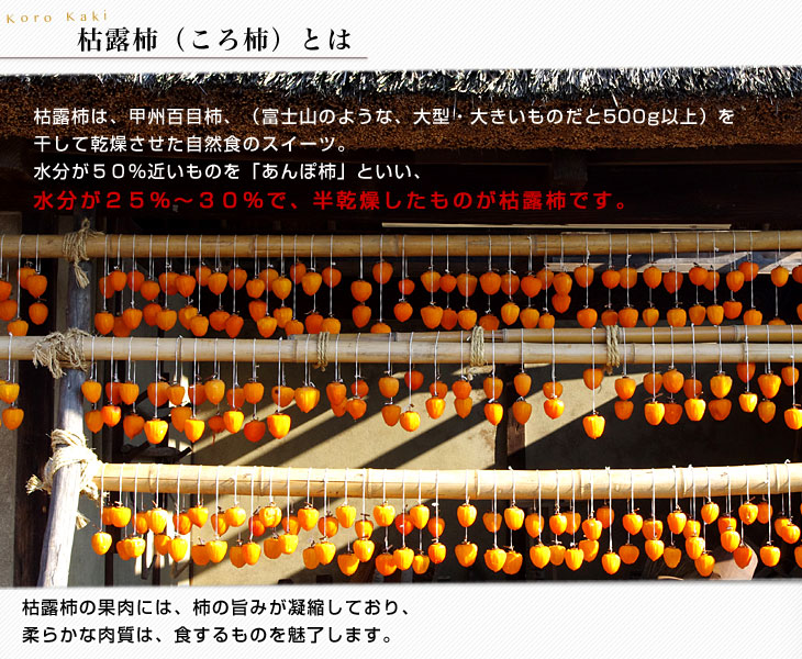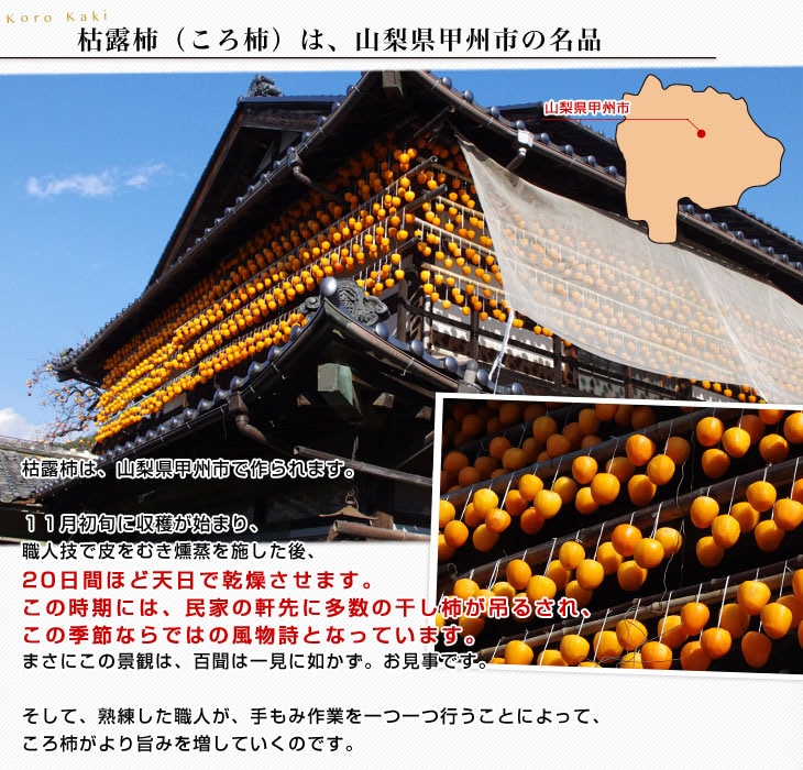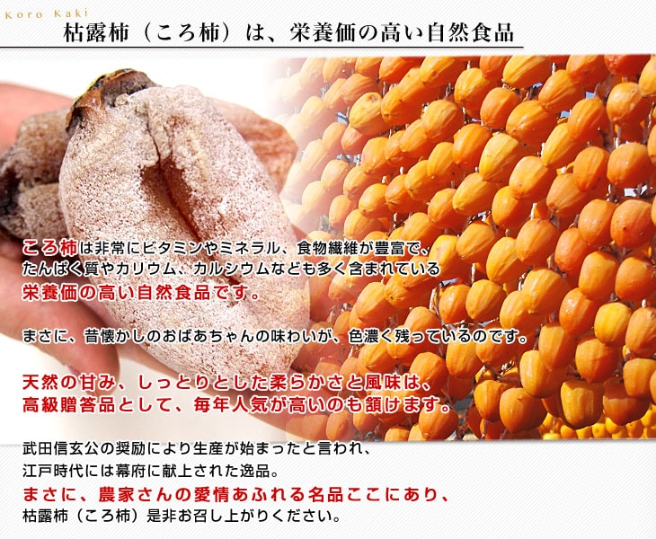 武田信玄が奨励品として、古くから生産され、江戸時代には幕府にも献上されていた逸品。愛情たっぷりに仕上げた山梨松里の枯露柿(干し柿)をお届けします。