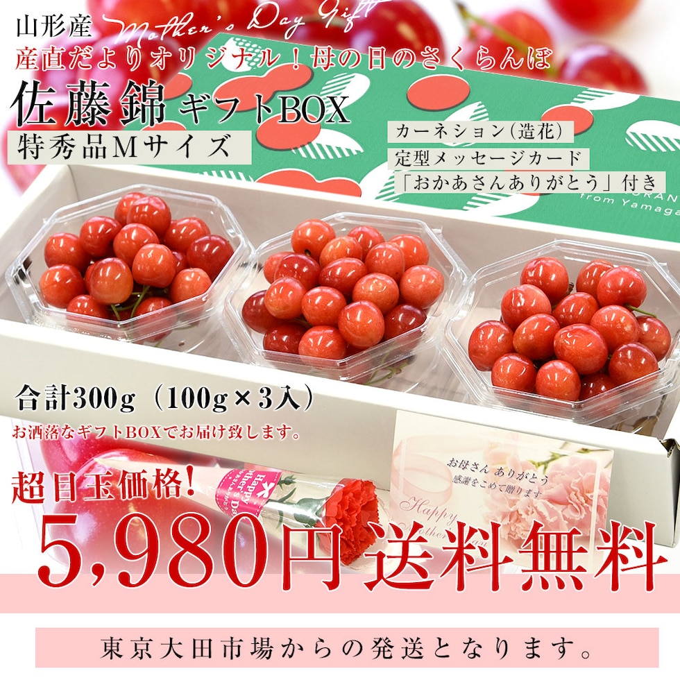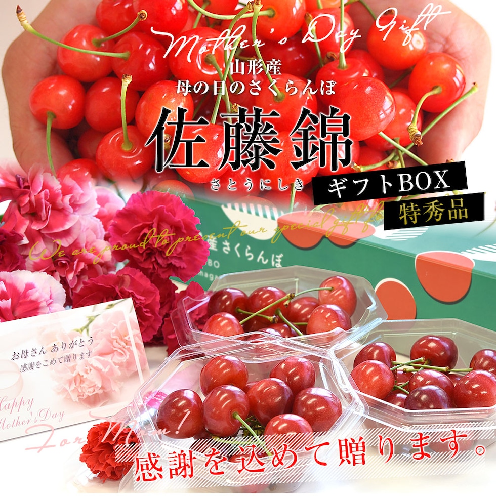 温室ハウス栽培を手がける生産者は、とっても少なく、この時期のさくらんぼは、大変希少となります。そして母の日に用意するのは、中でも最高級品種と言われる「佐藤錦」です。甘さと程好い酸味のバランスがよく、お母さまをさくらんぼの虜にします。