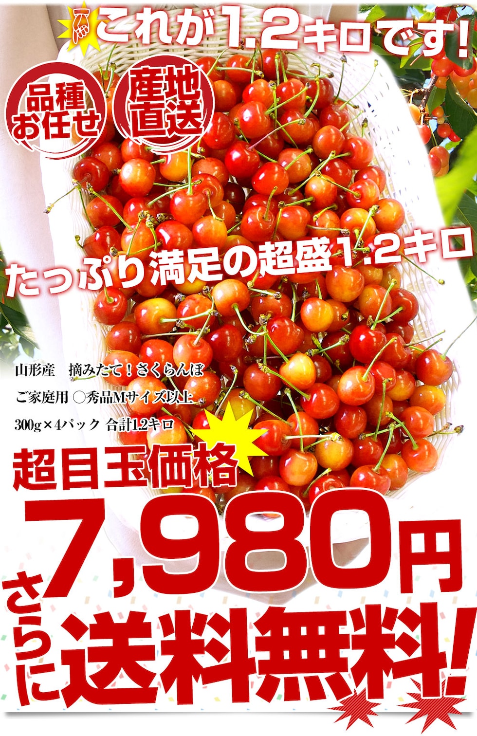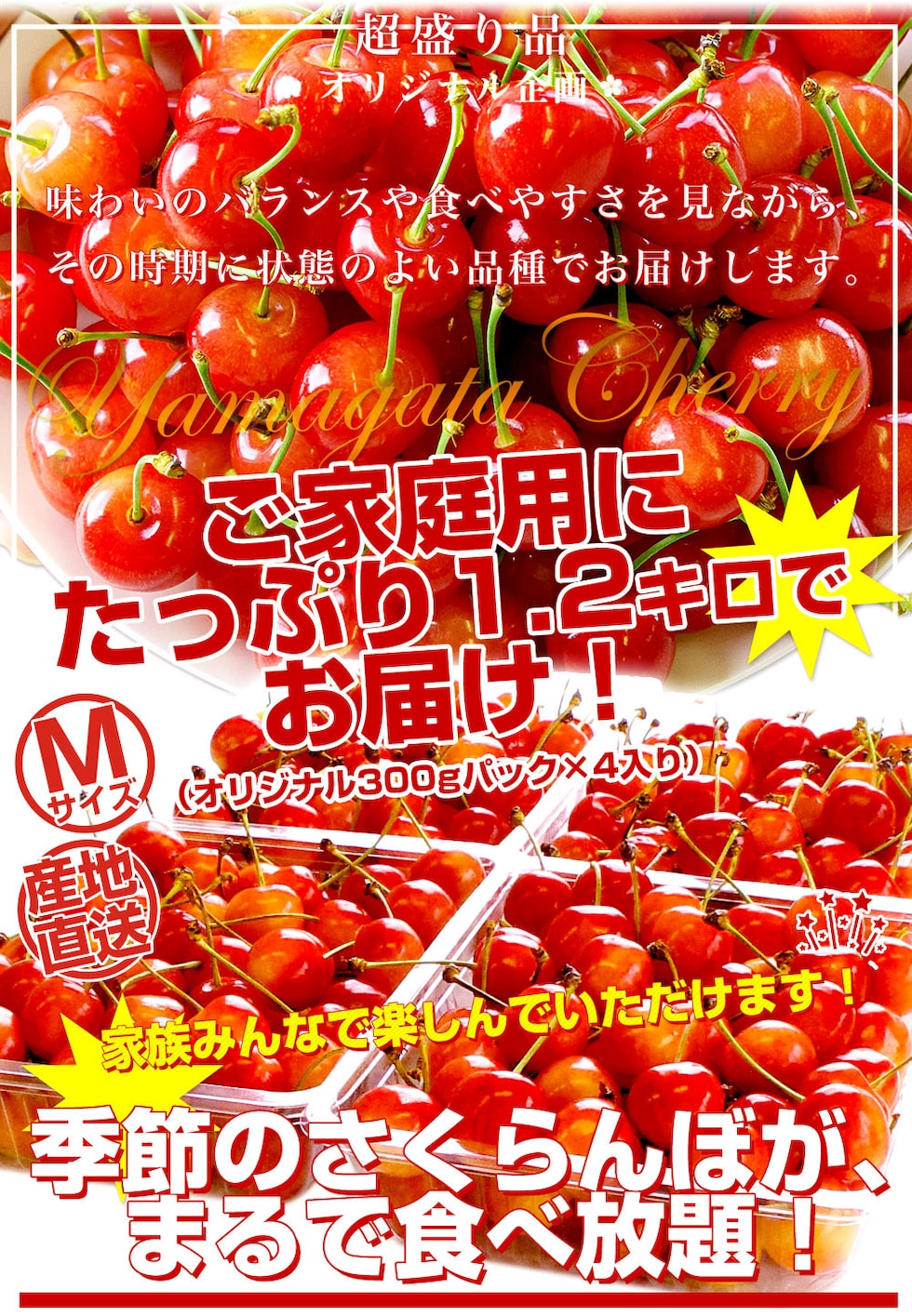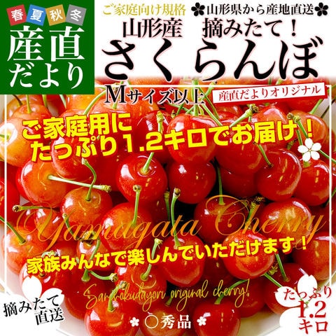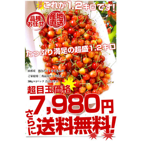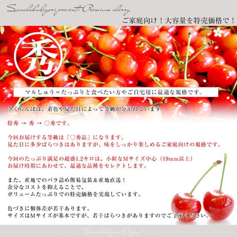 山形県より産地直送!品種おまかせ ご家庭用 さくらんぼ 大ボリューム1.2キロ ○秀品Mサイズ以上(300g×4パック)桜桃 送料無料 クール便 サクランボ